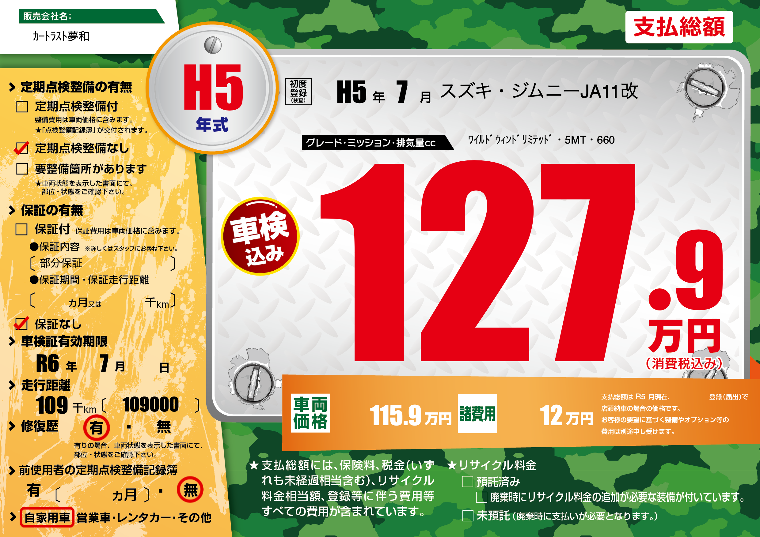 | 走行キロ | 10.9万km | 初年度登録 | H5年7月 |