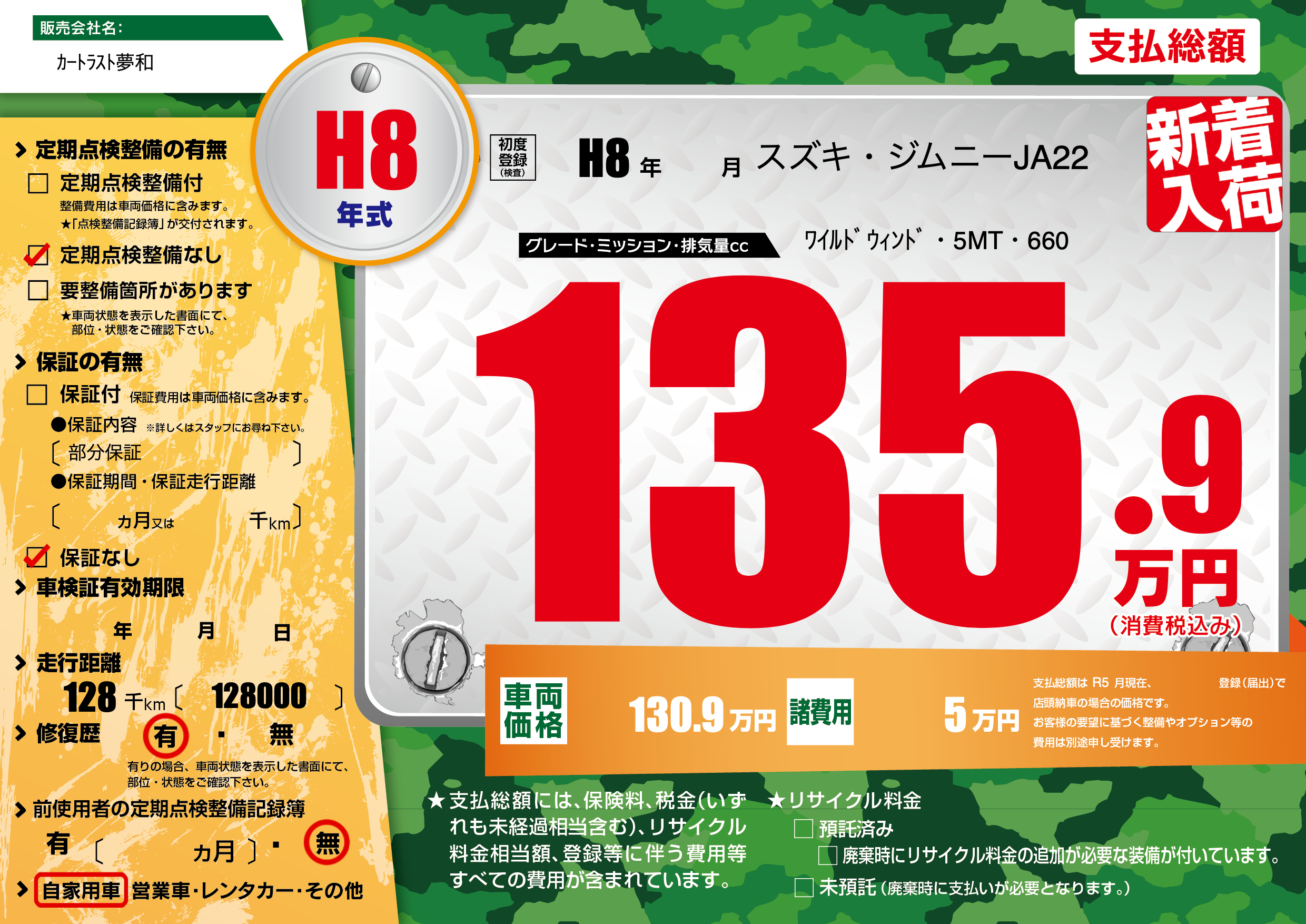 | 走行キロ | 12.8万km | 初年度登録 | H8年---月 |