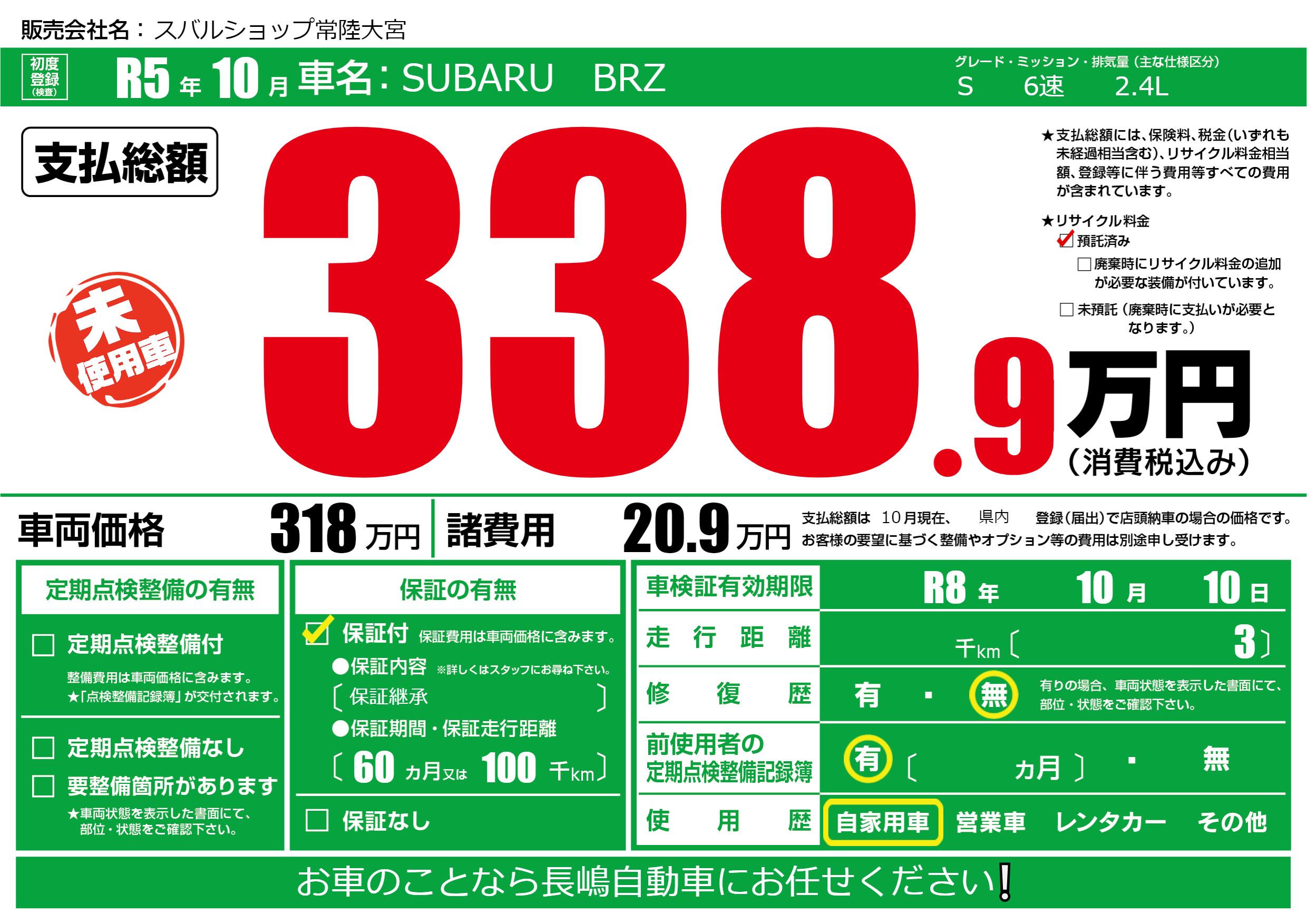 | 車名 | SUBARU BRZ | グレード ミッション 排気量 |