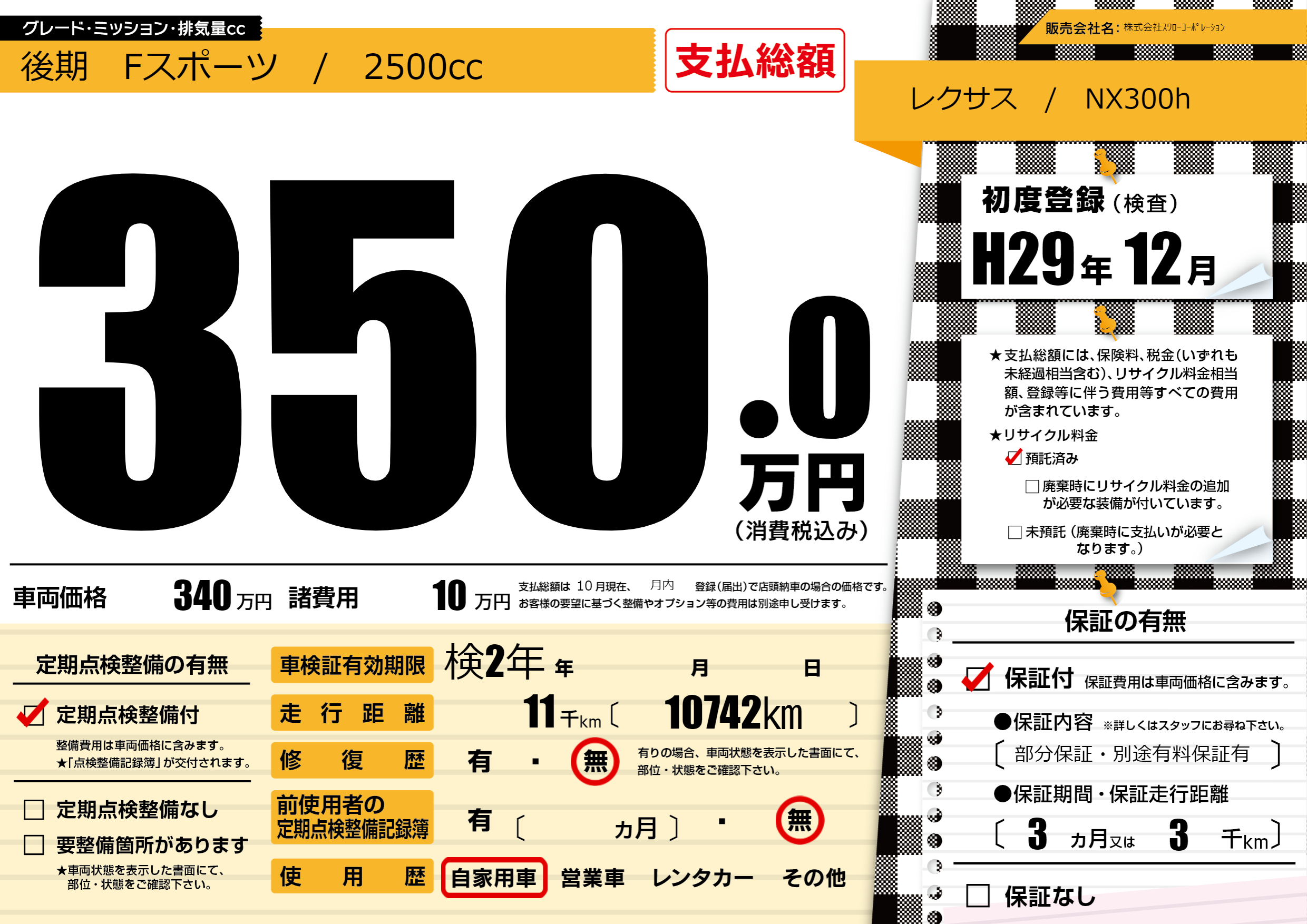 | 車名 | レクサス / NX300h | グレード ミッション 排気量 |
