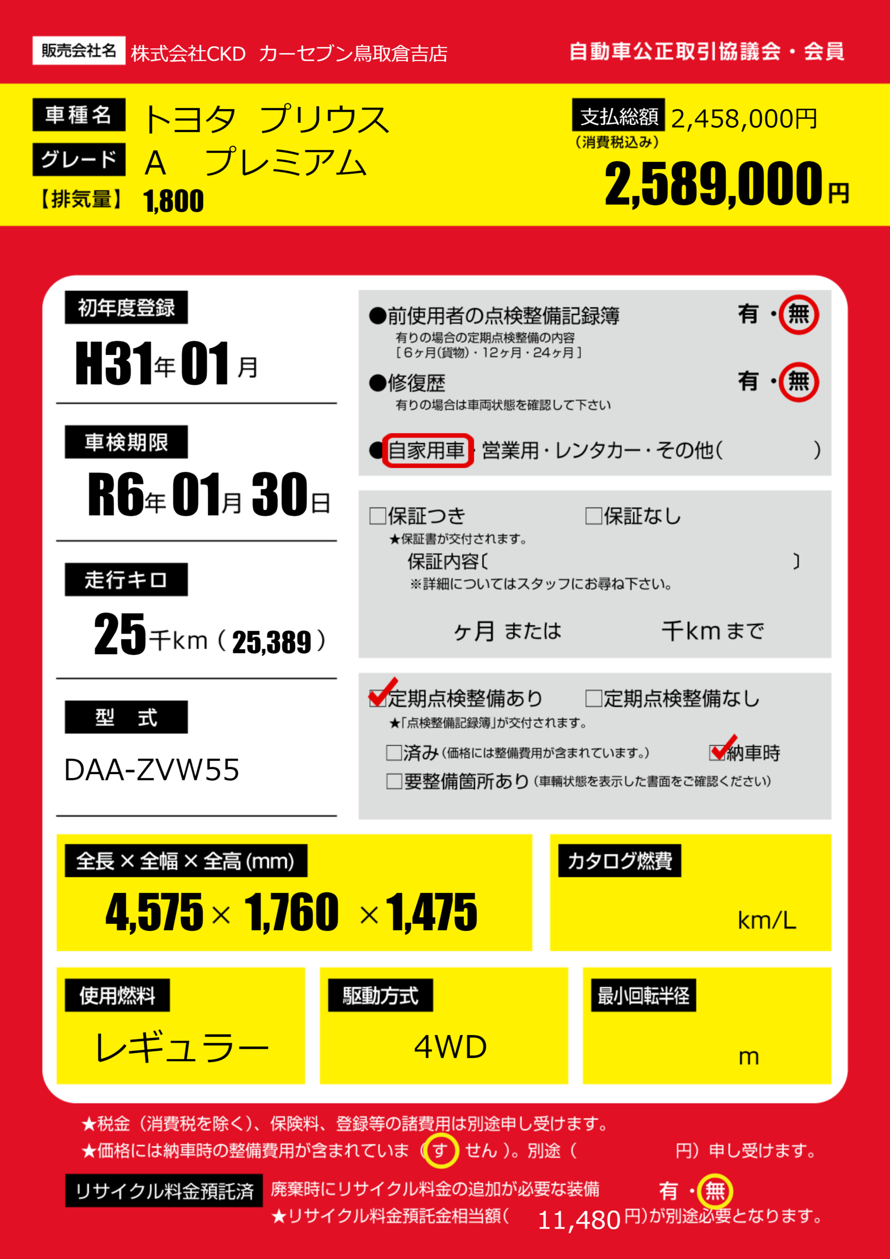 | 車名 | トヨタ プリウス | グレード ミッション 排気量 |