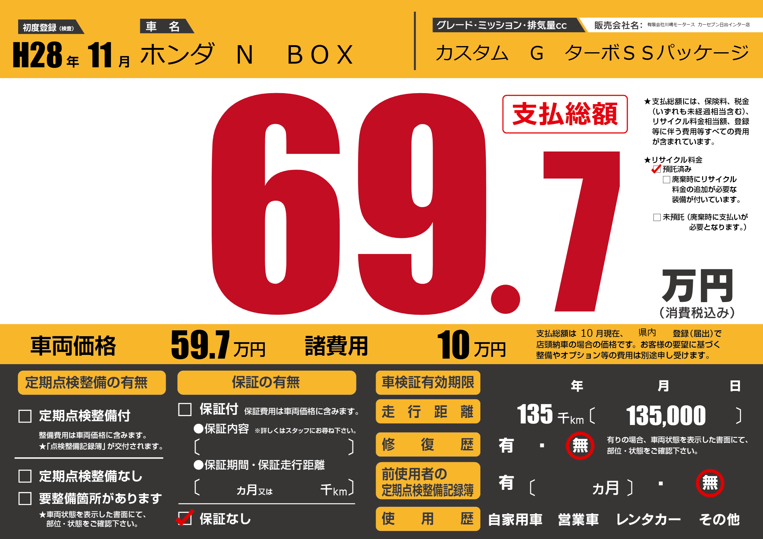 | 走行キロ | 13.5万km | 初年度登録 | H28年11月 |