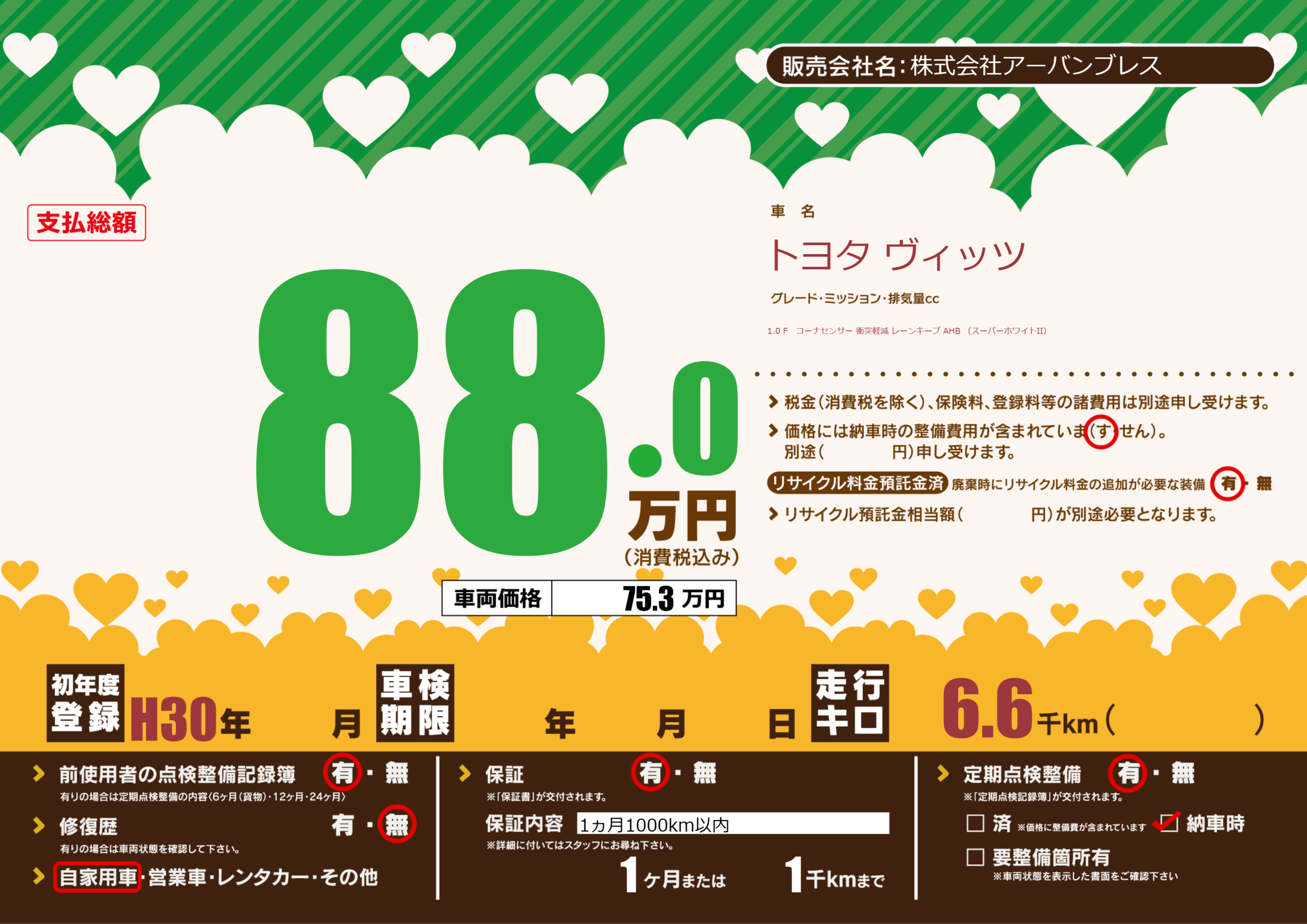 | 車名 | トヨタ ヴィッツ | グレード ミッション 排気量 |