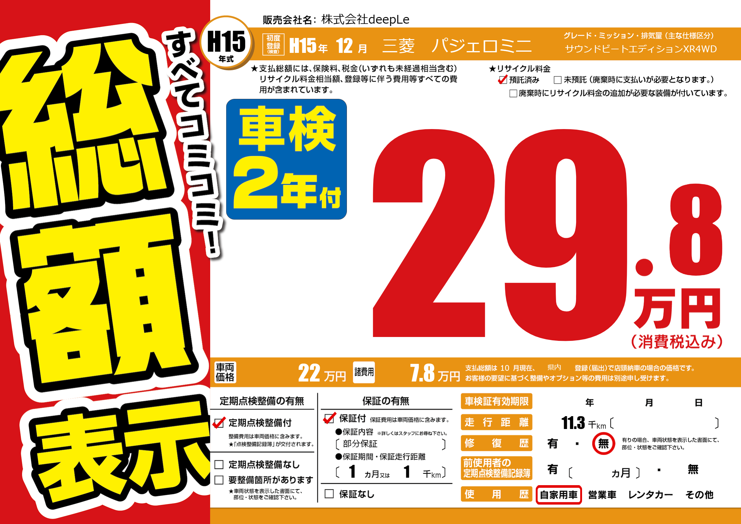 | 車名 | 三菱 パジェロミニ | グレード ミッション 排気量 |
