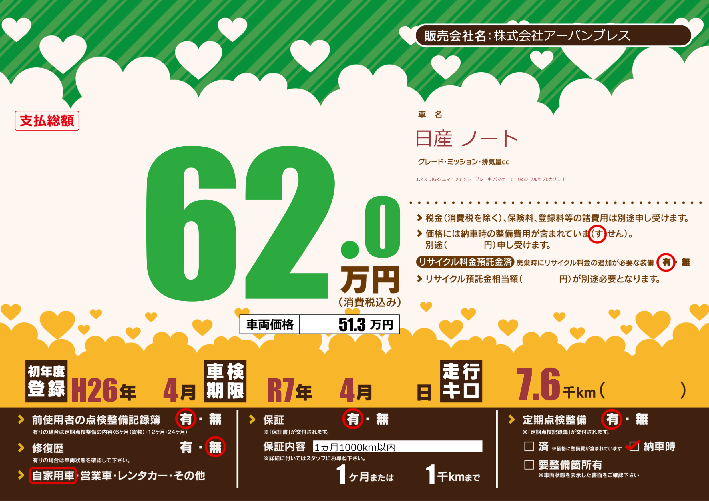 | 車名 | 日産 ノート | グレード ミッション 排気量 |