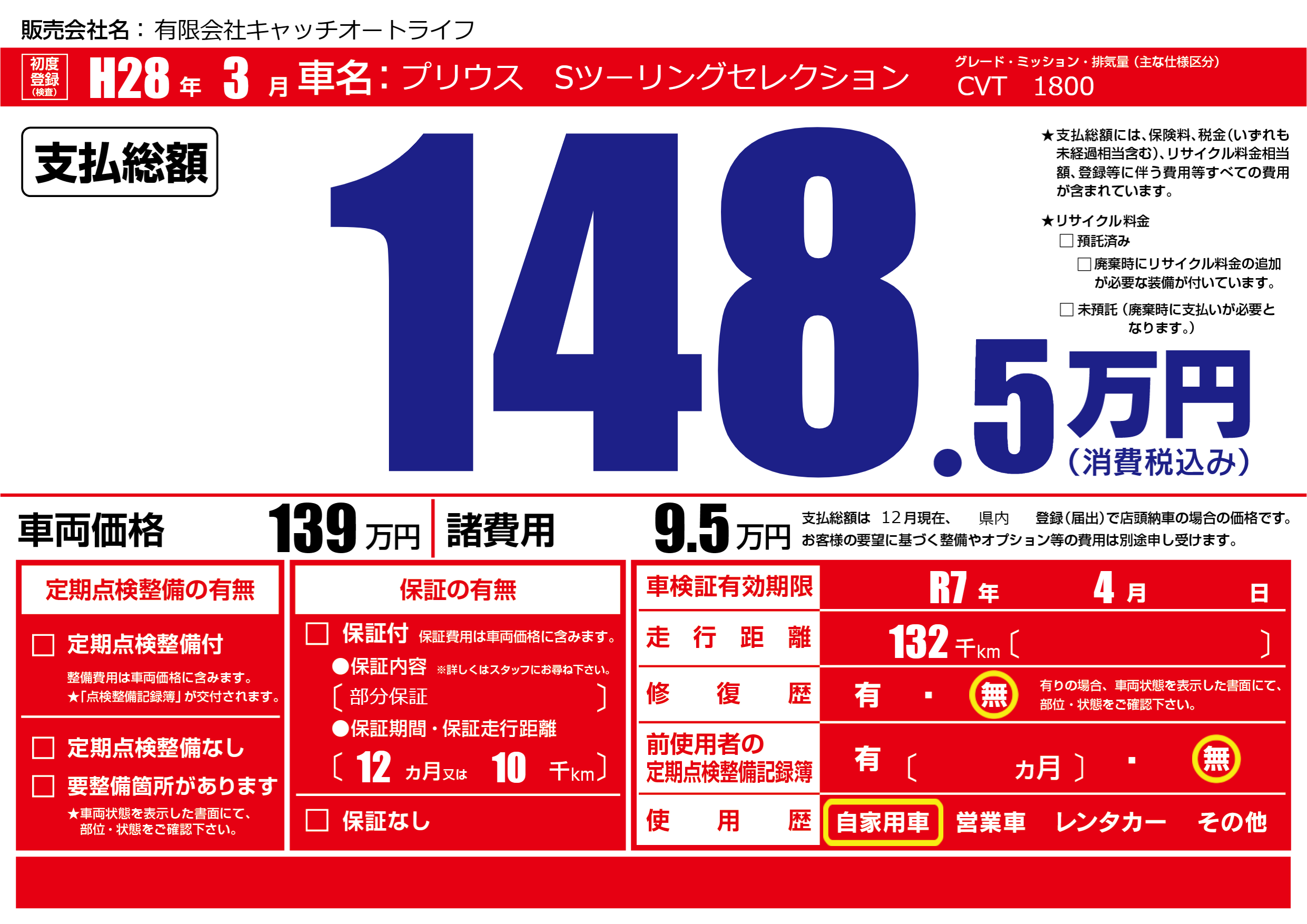 | 車名 | プリウス Sツーリングセレクション | グレード ミッション 排気量 |