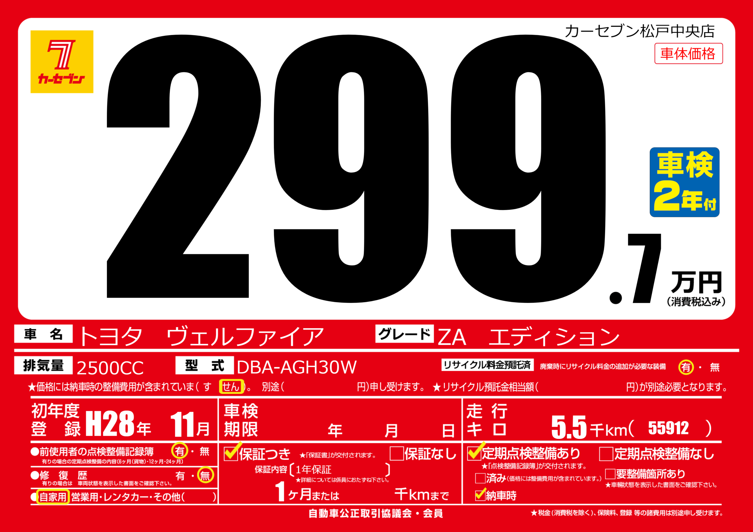 | 車名 | トヨタ ヴェルファイア | グレード ミッション 排気量 |