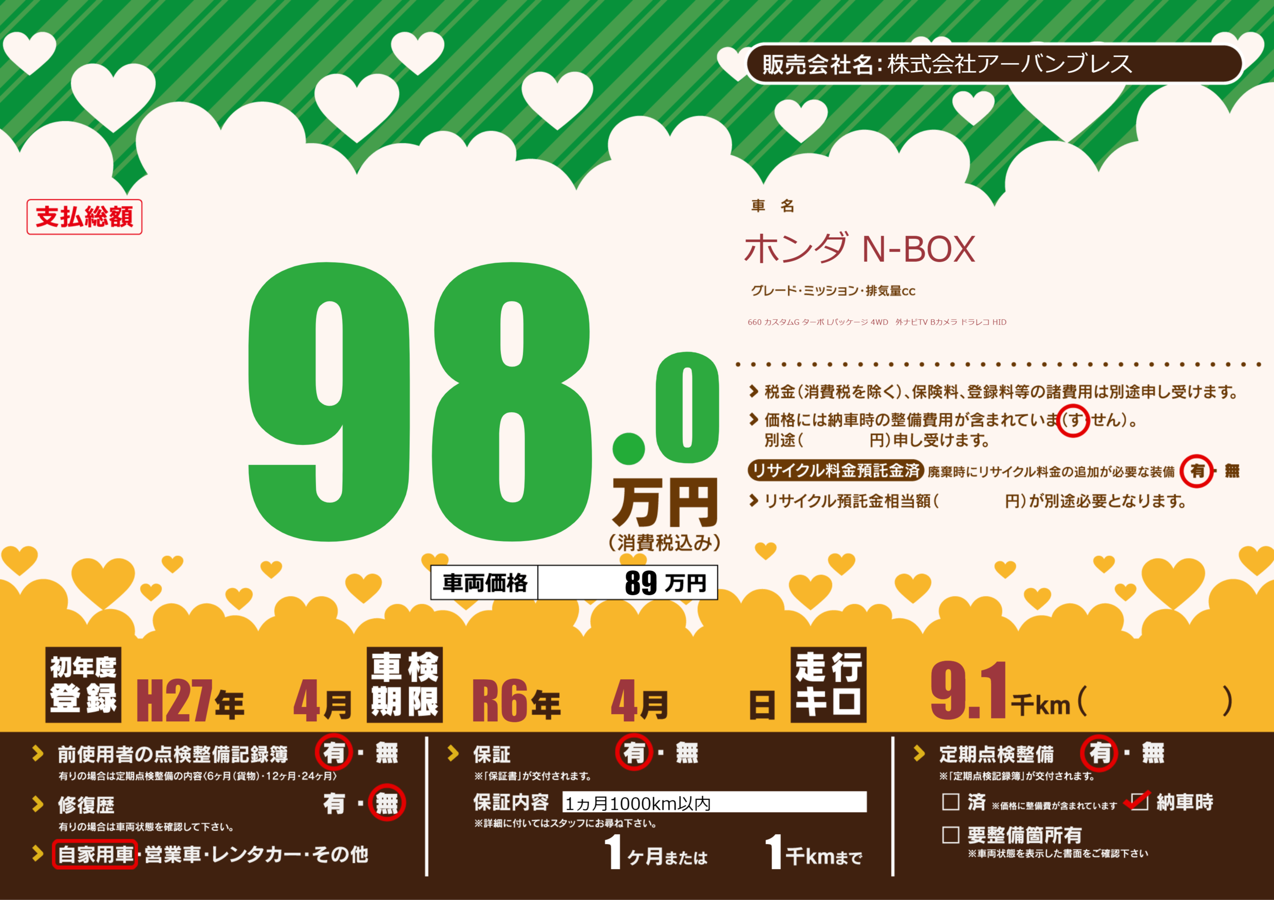 | 車名 | ホンダ N-BOX | グレード ミッション 排気量 |