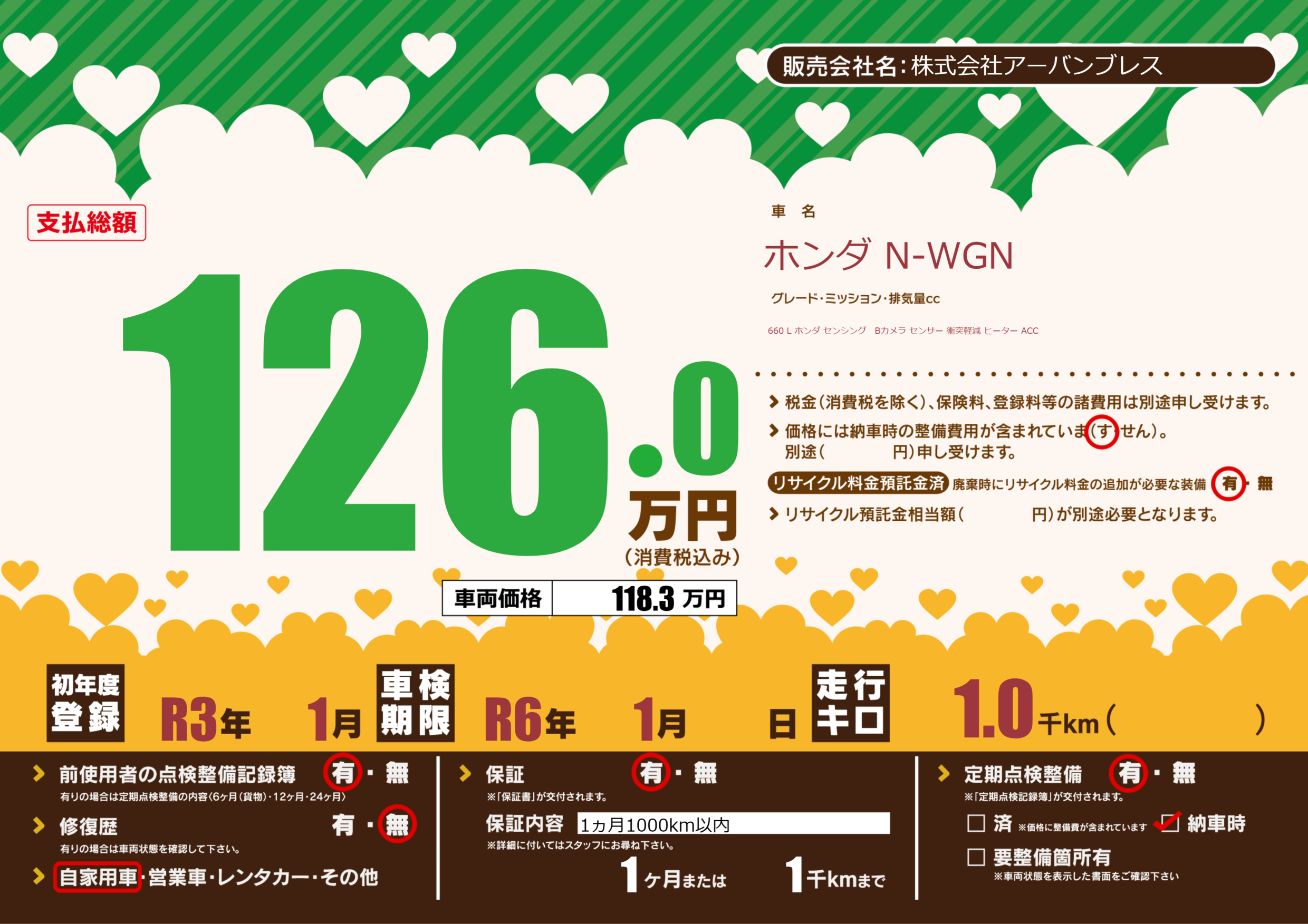 | 車名 | ホンダ N-WGN | グレード ミッション 排気量 |
