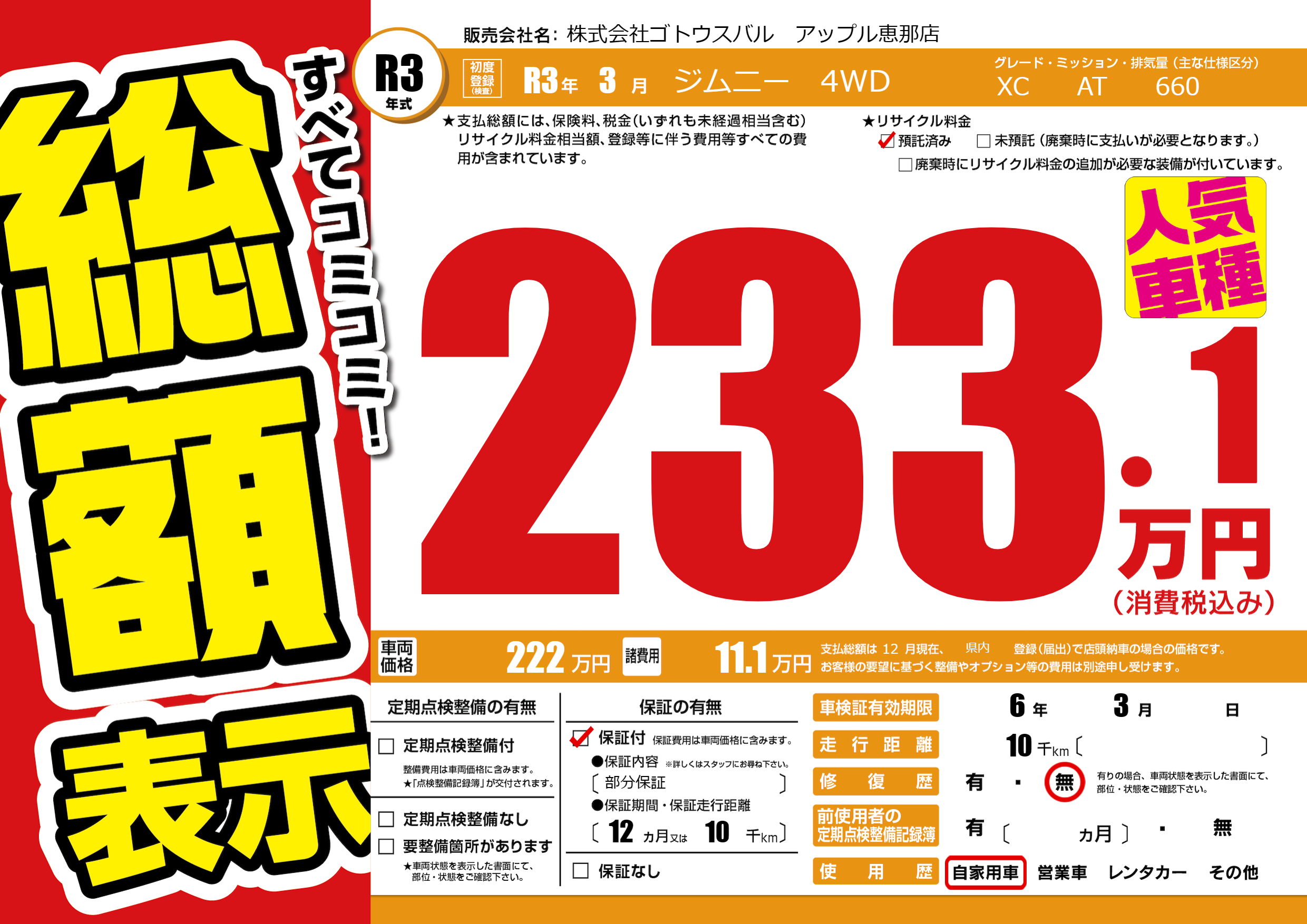 | 車名 | ジムニー 4WD | グレード ミッション 排気量 |