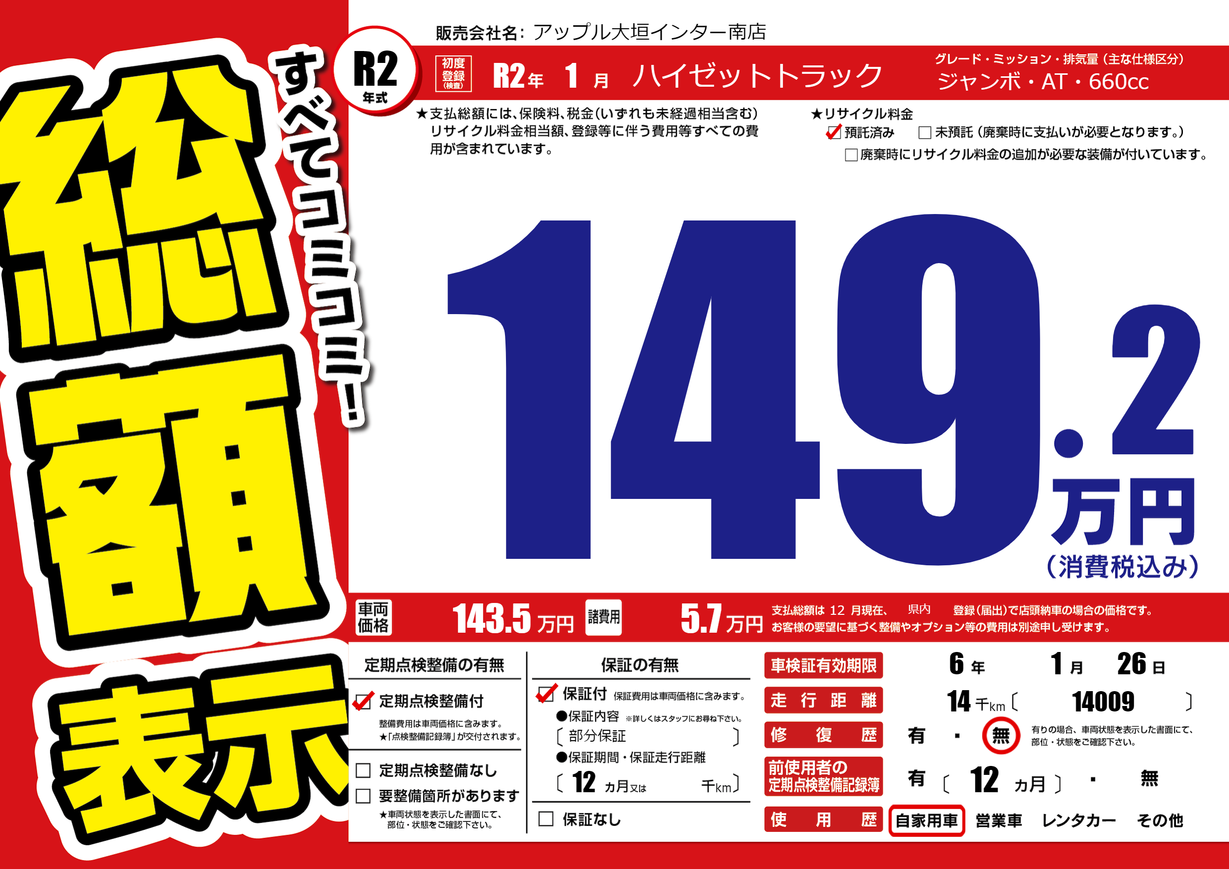 | 車名 | ハイゼットトラック | グレード ミッション 排気量 |