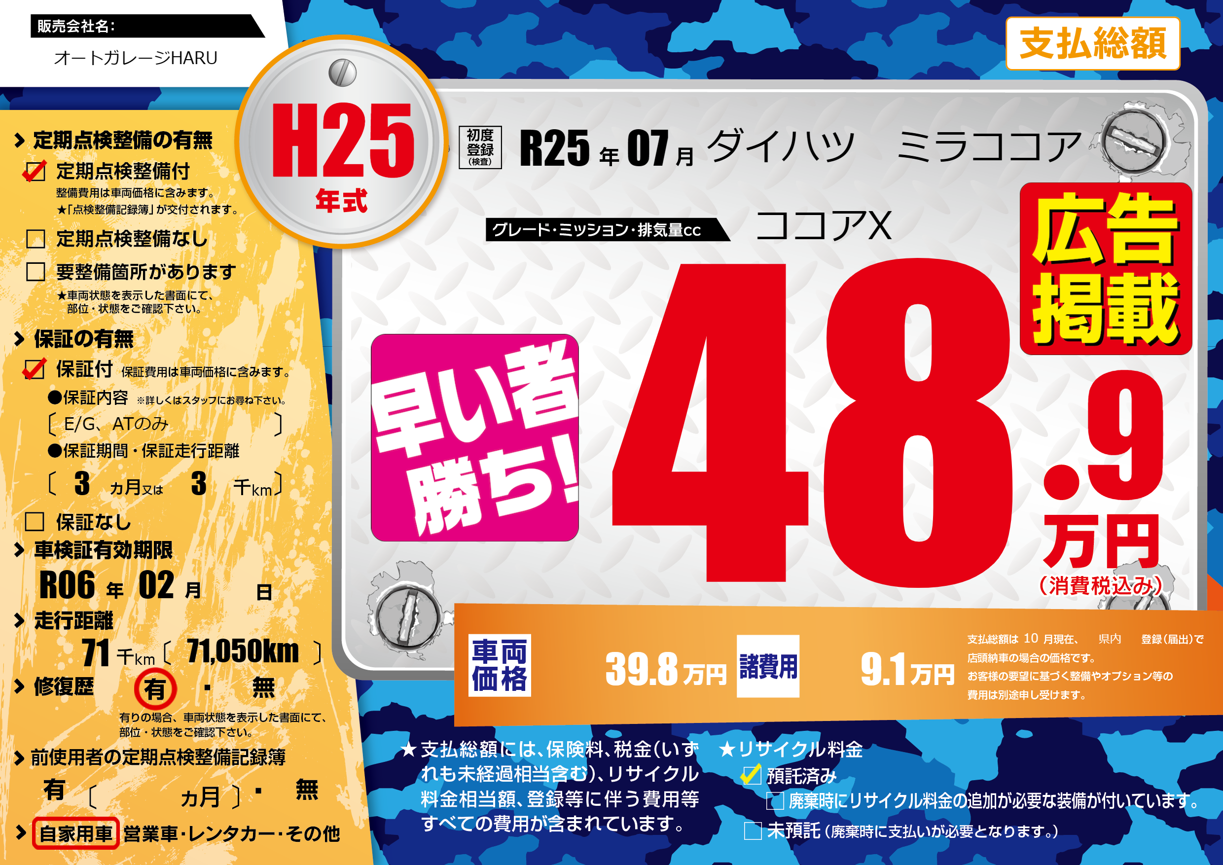 | 走行キロ | 7.1万km | 初年度登録 | R25年07月 |