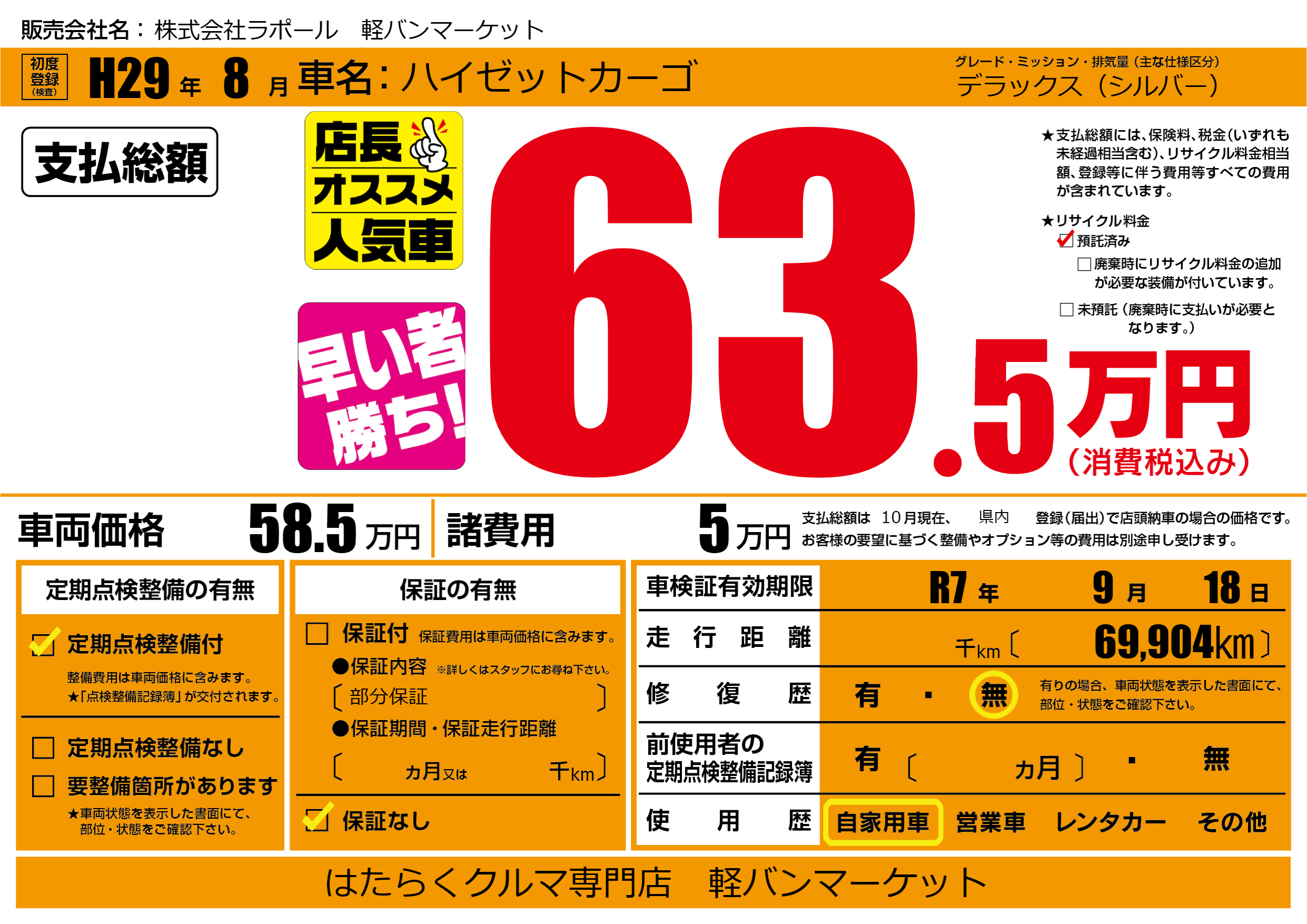 | 車名 | ハイゼットカーゴ | グレード ミッション 排気量 |