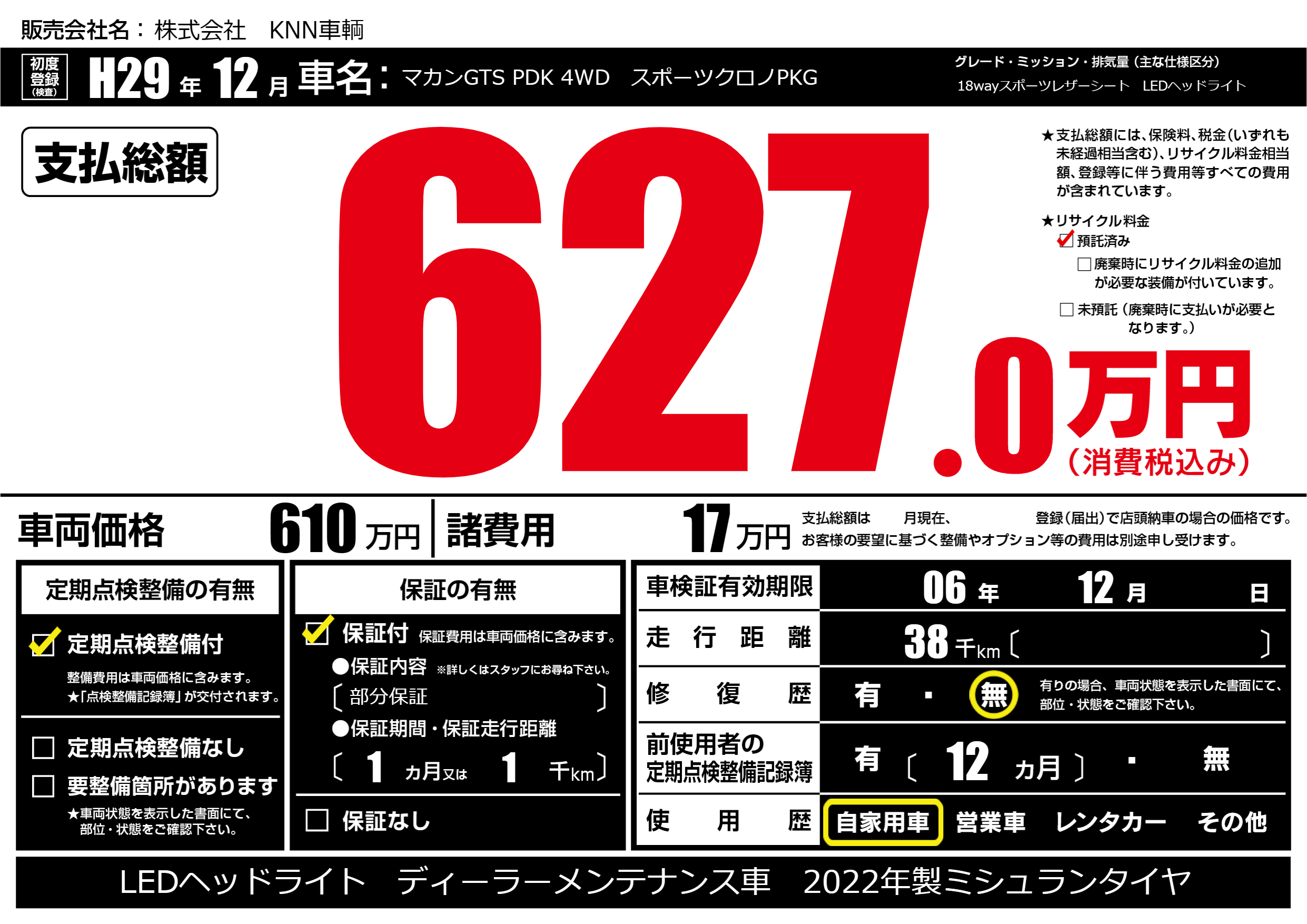 | 車名 | マカンGTS PDK 4WD スポーツクロノPKG | グレード ミッション 排気量 |