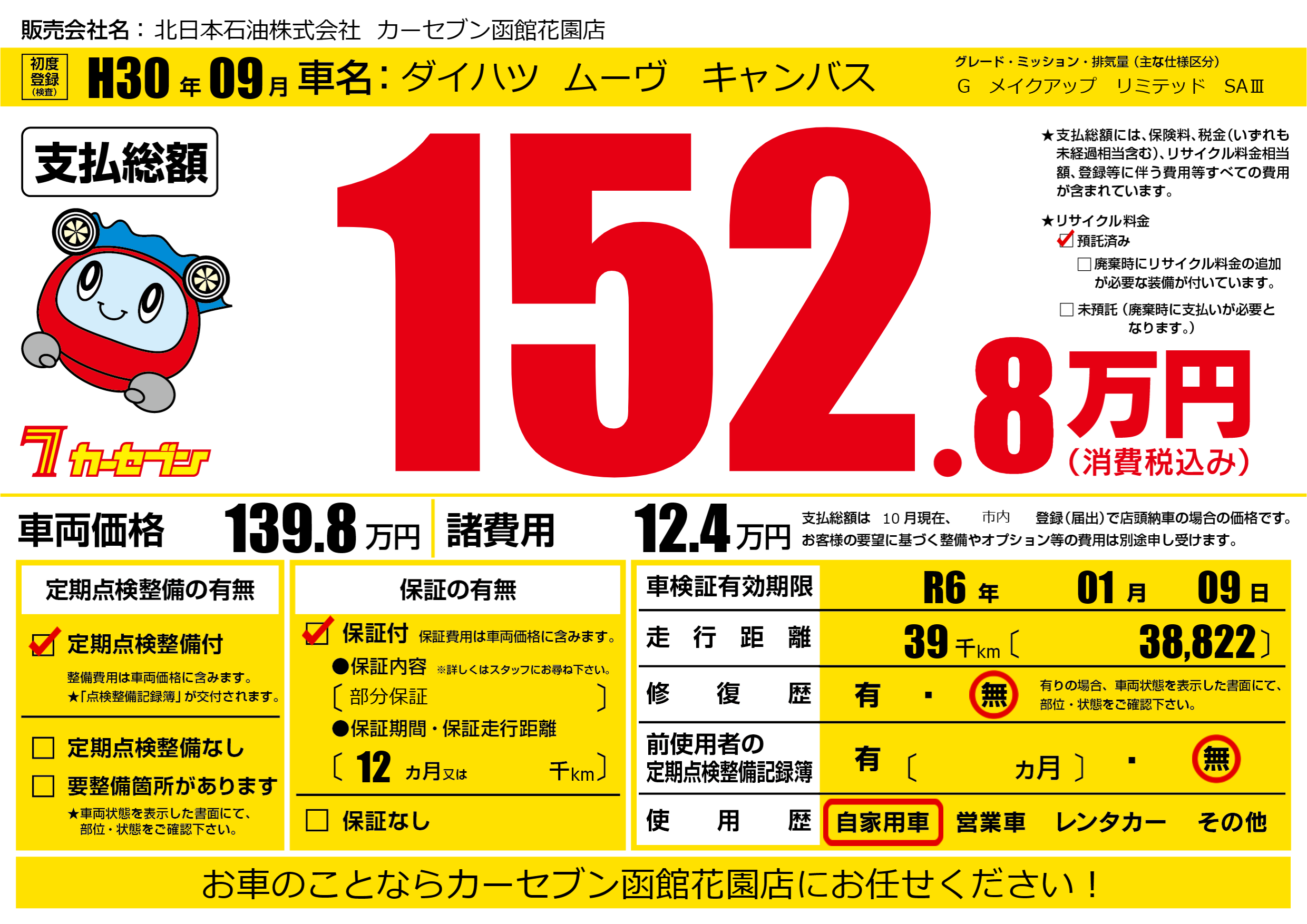 | 走行キロ | 3.9万km | 初年度登録 | H30年09月 |