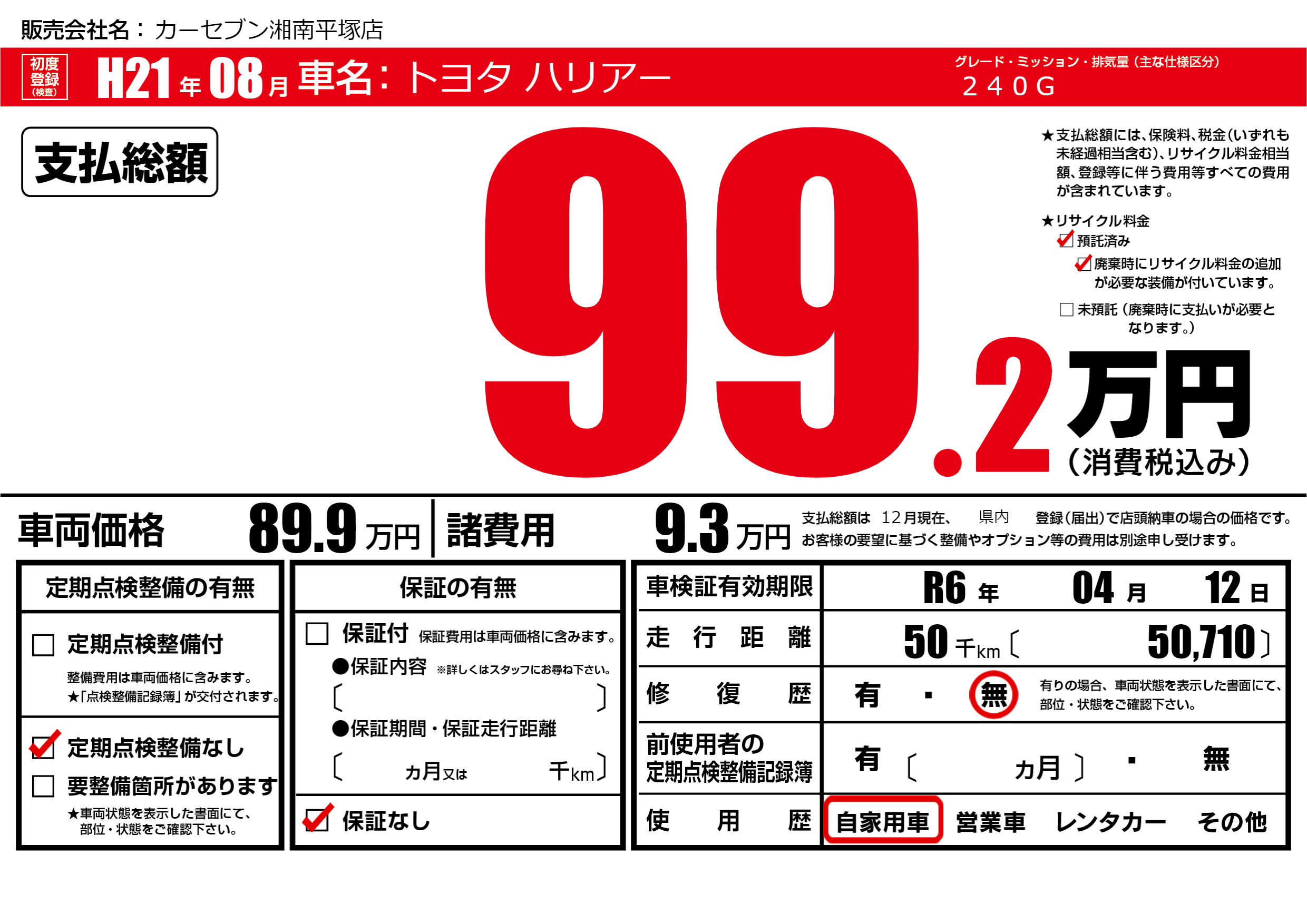 | 走行キロ | 5万km | 初年度登録 | H21年08月 |