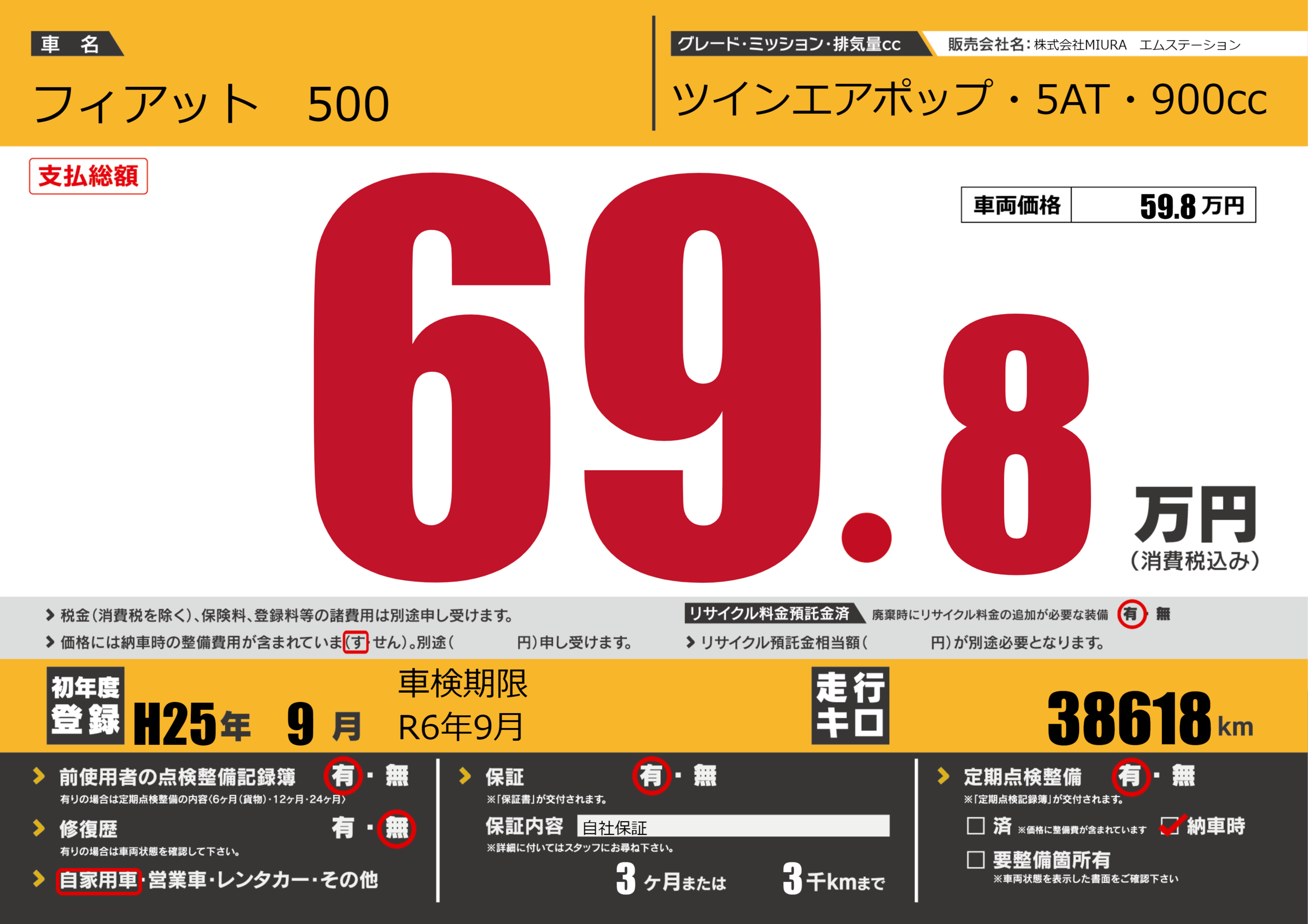 | 車名 | フィアット 500 | グレード ミッション 排気量 |