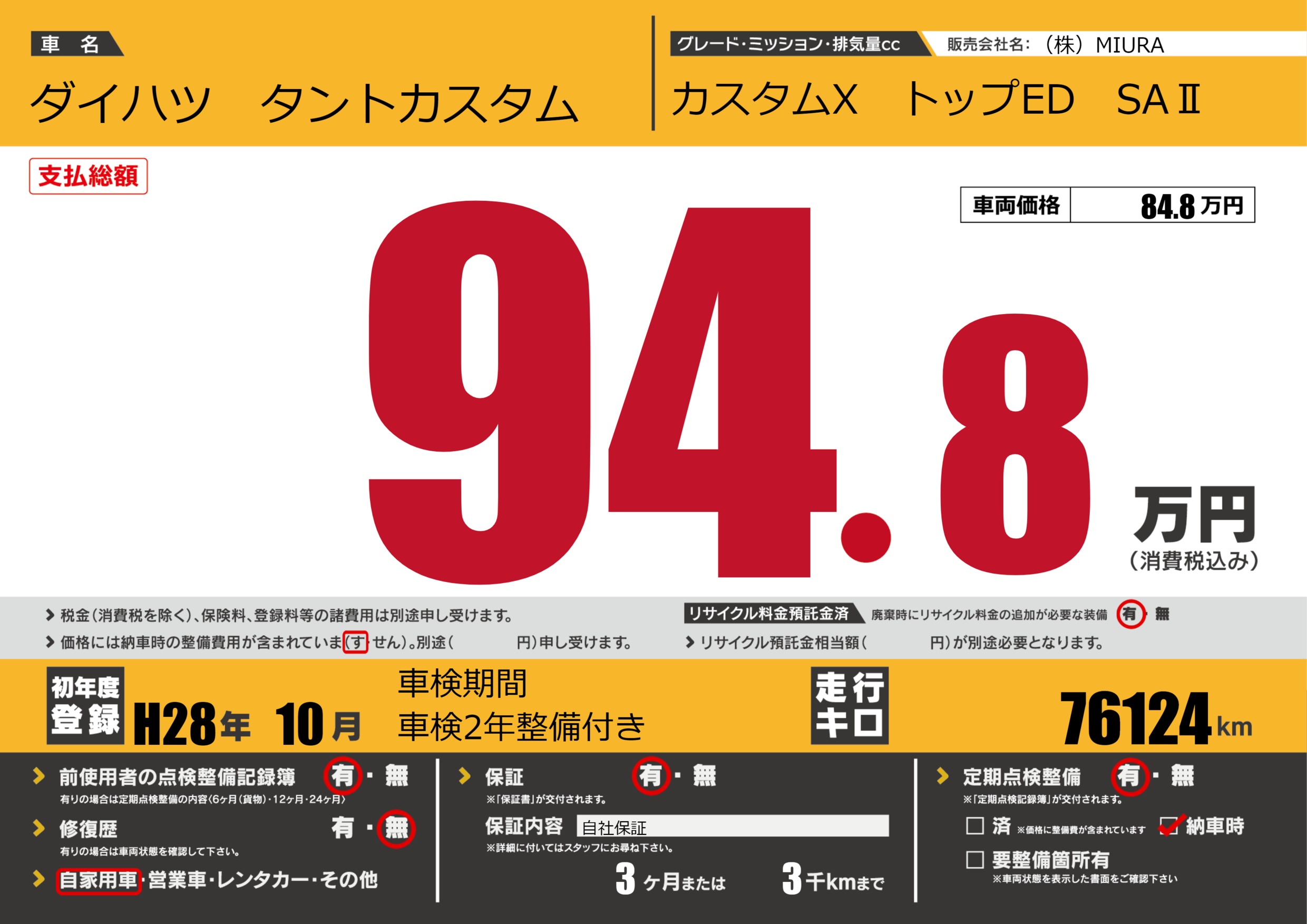 保証付き 保証内容(自社保証) 3ヶ月または(3)千kmまで |