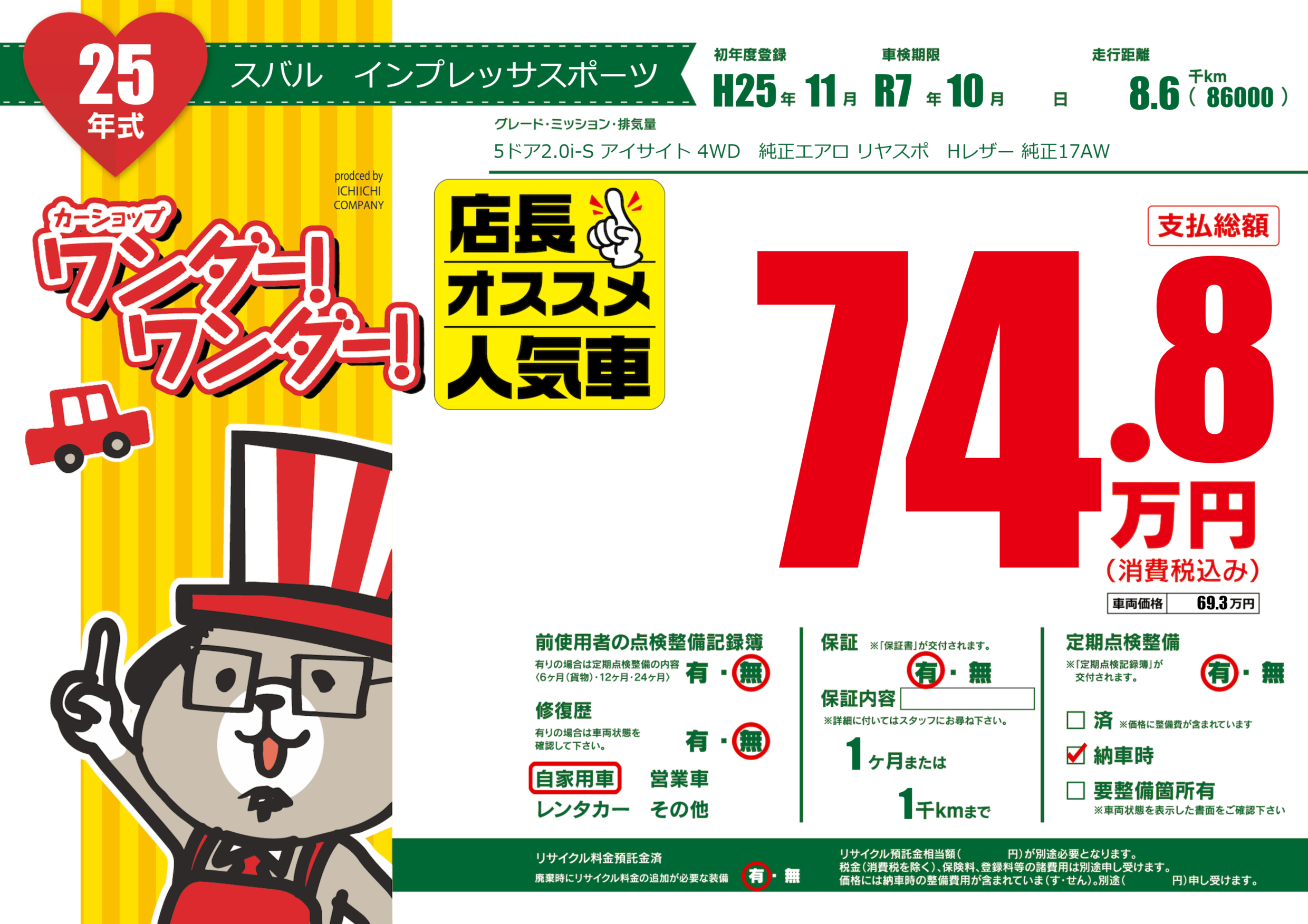 | 車名 | スバル インプレッサスポーツ | グレード ミッション 排気量 |