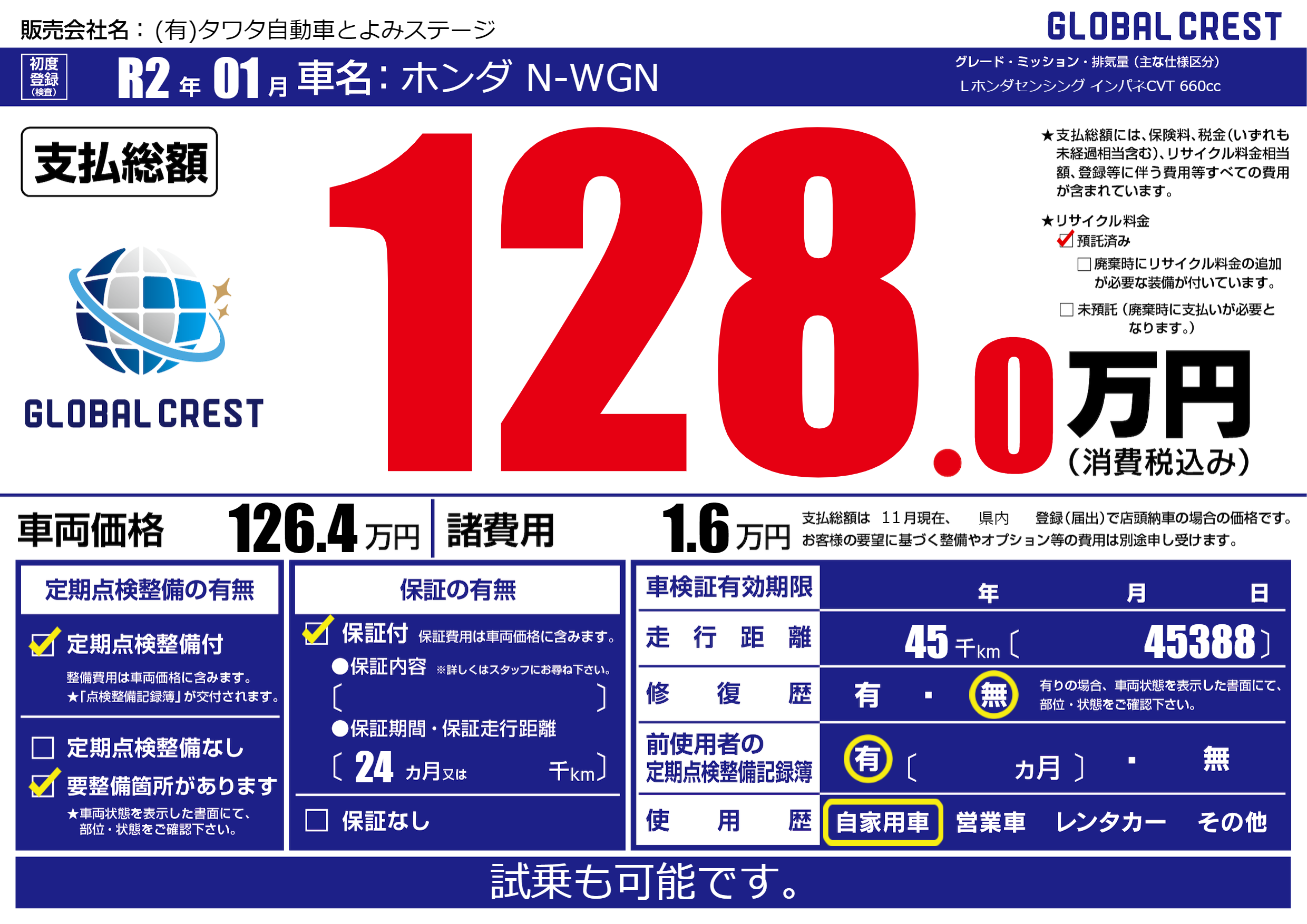 | 車名 | ホンダ N-WGN | グレード ミッション 排気量 |