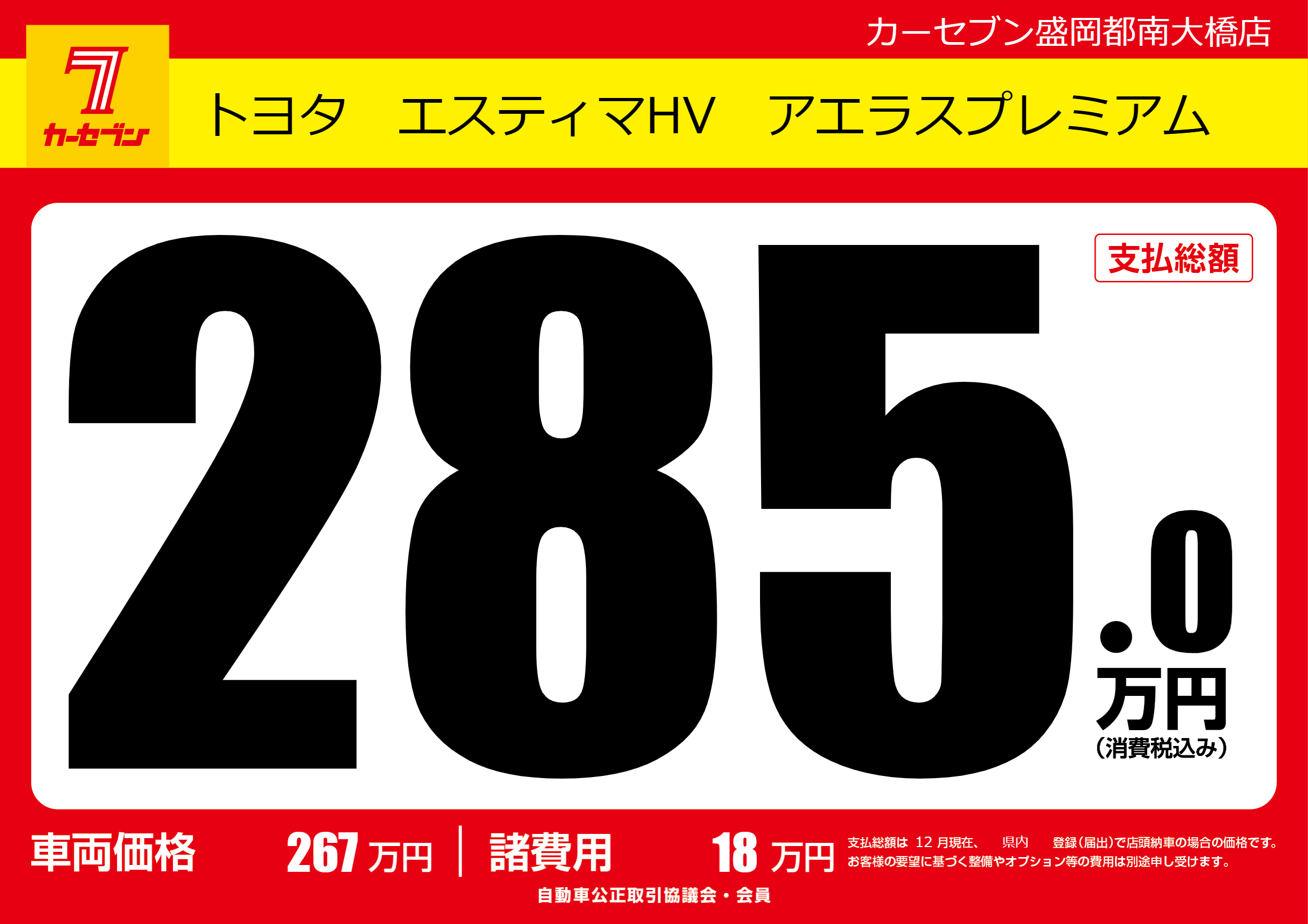 | 車名 | トヨタ エスティマHV アエラスプレミアム | グレード ミッション 排気量 |