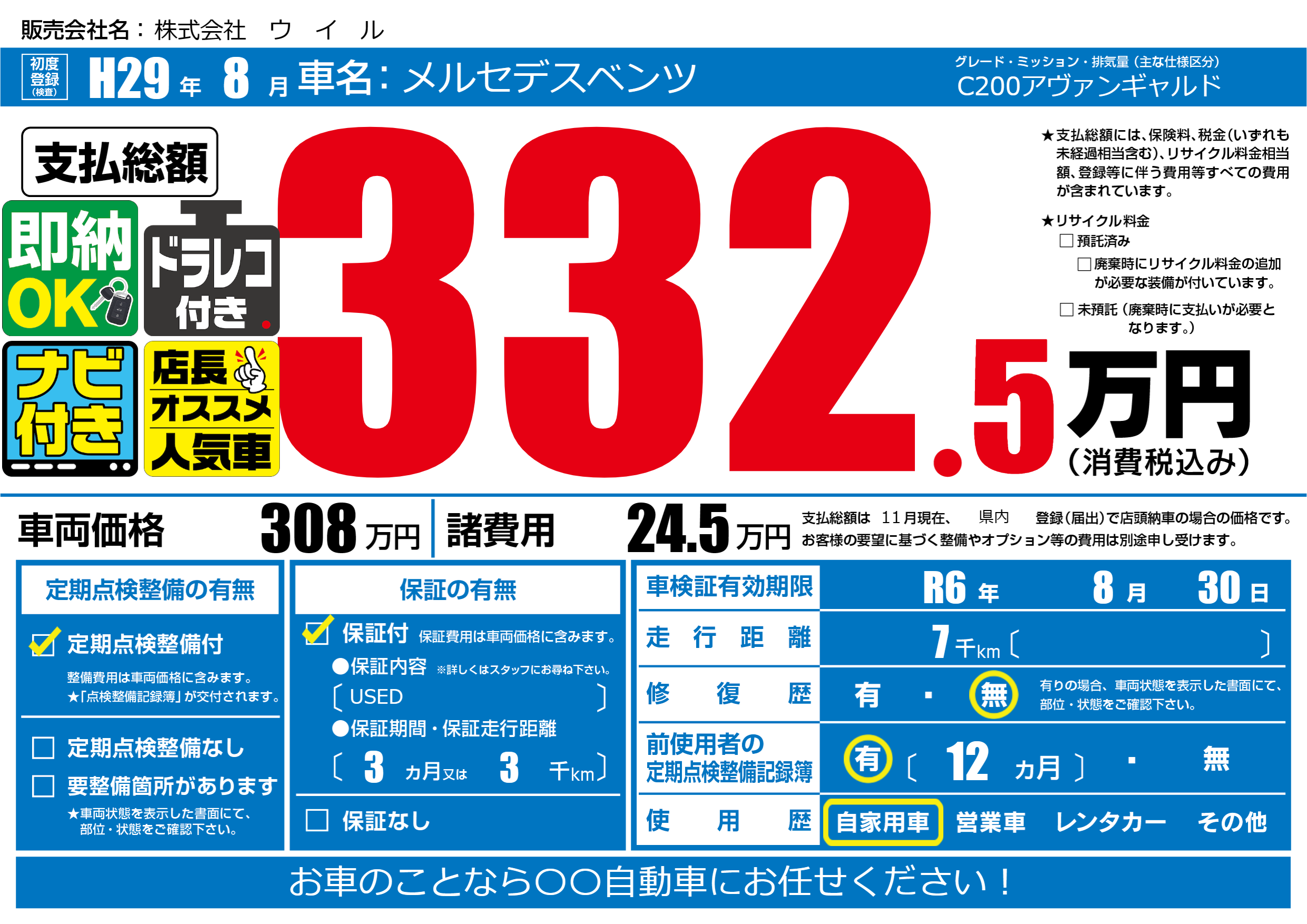 | 車名 | メルセデスベンツ | グレード ミッション 排気量 |