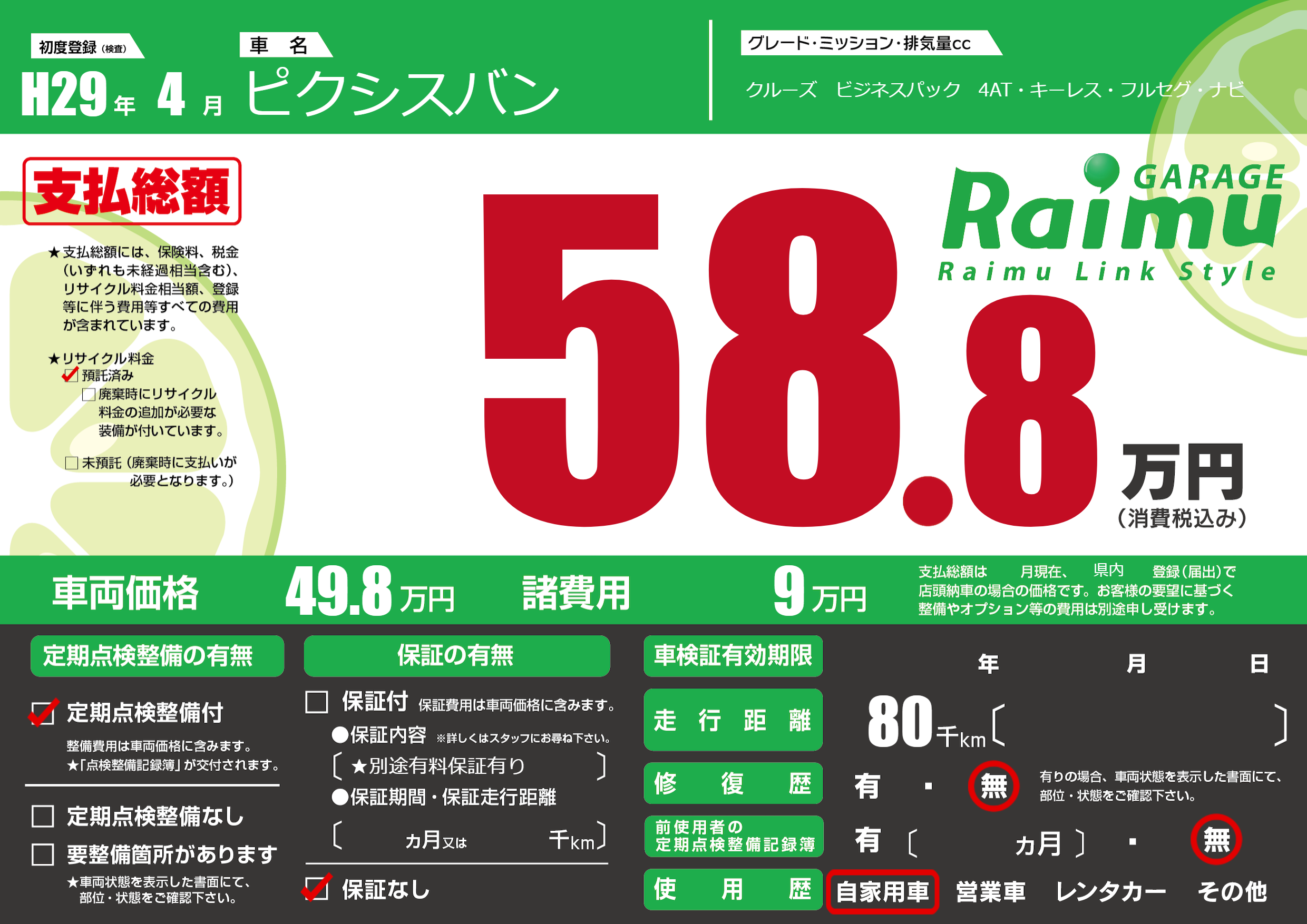 保証なし 保証内容(★別途有料保証有り) ---ヶ月または()千kmまで |