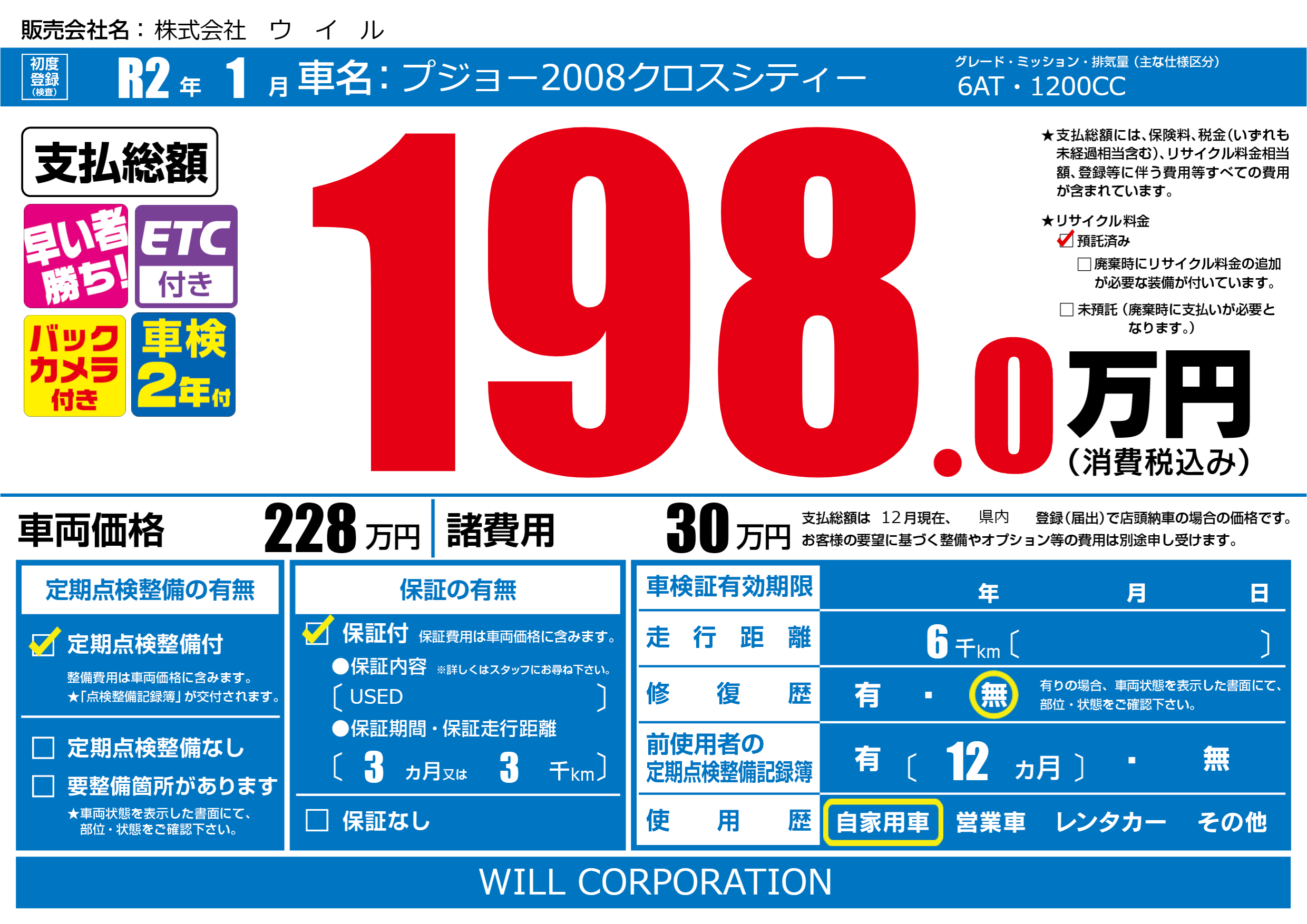 | 車名 | プジョー2008クロスシティー | グレード ミッション 排気量 |