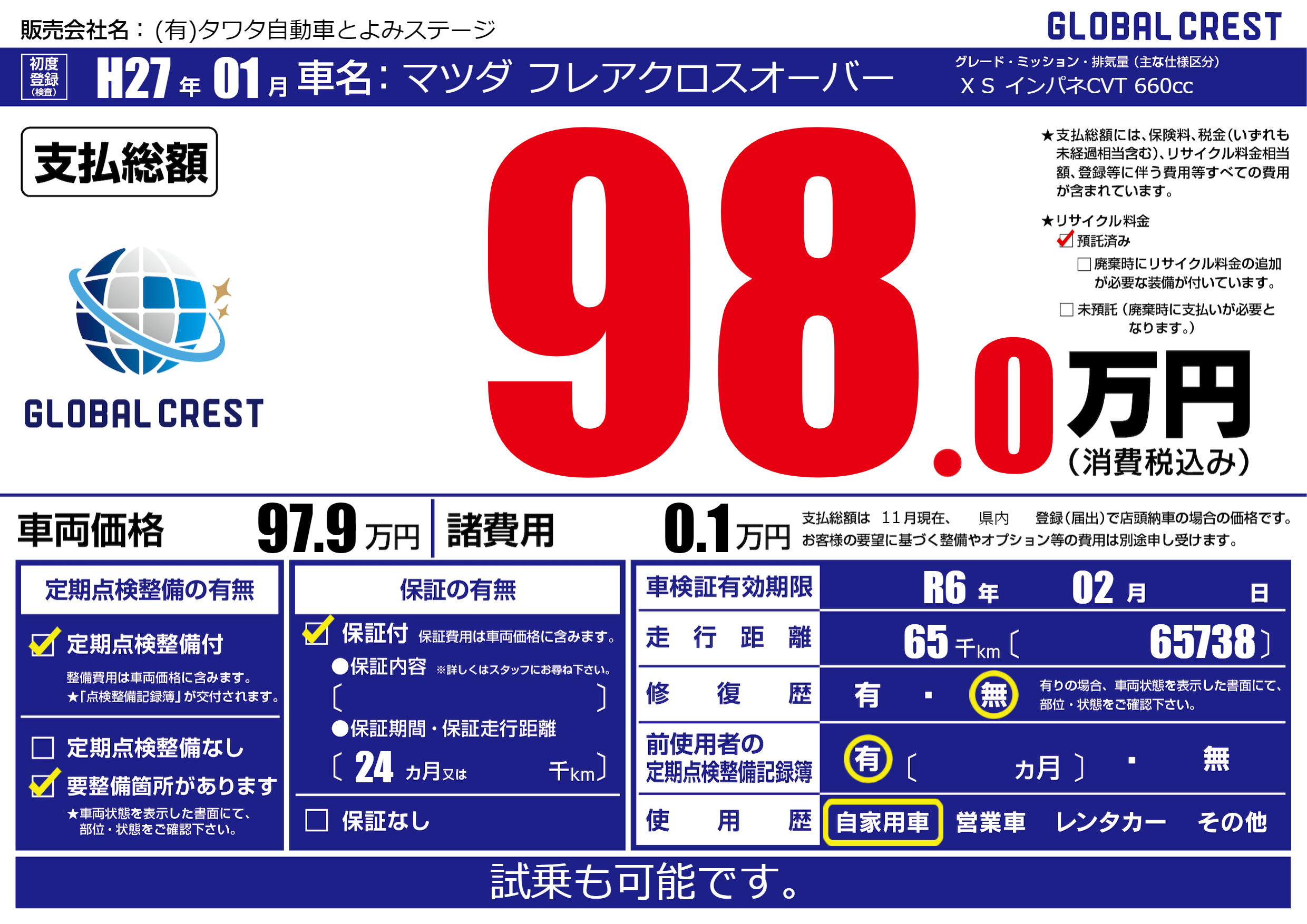| 車名 | マツダ フレアクロスオーバー | グレード ミッション 排気量 |