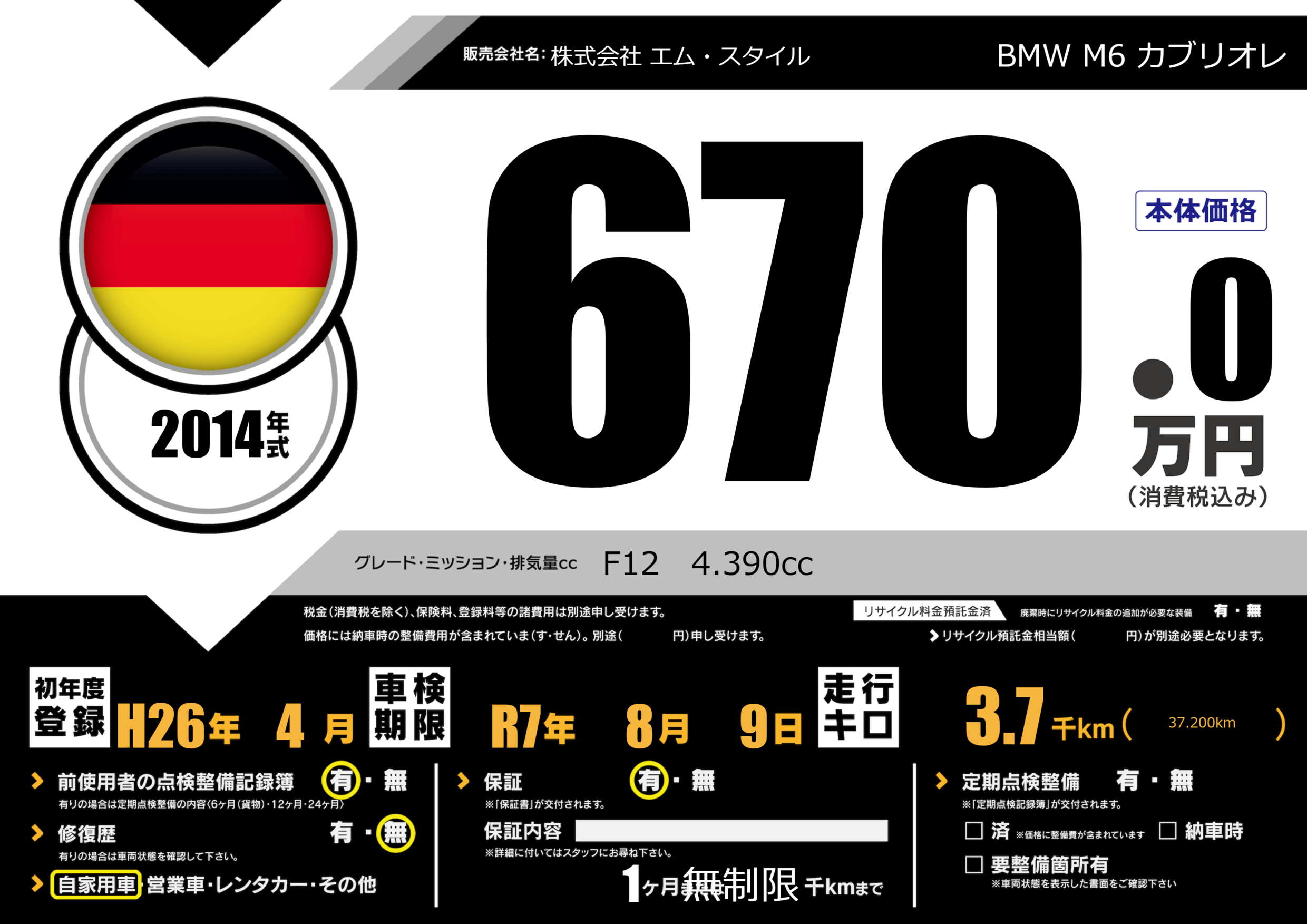 | 車名 | BMW M6 カブリオレ | グレード ミッション 排気量 |