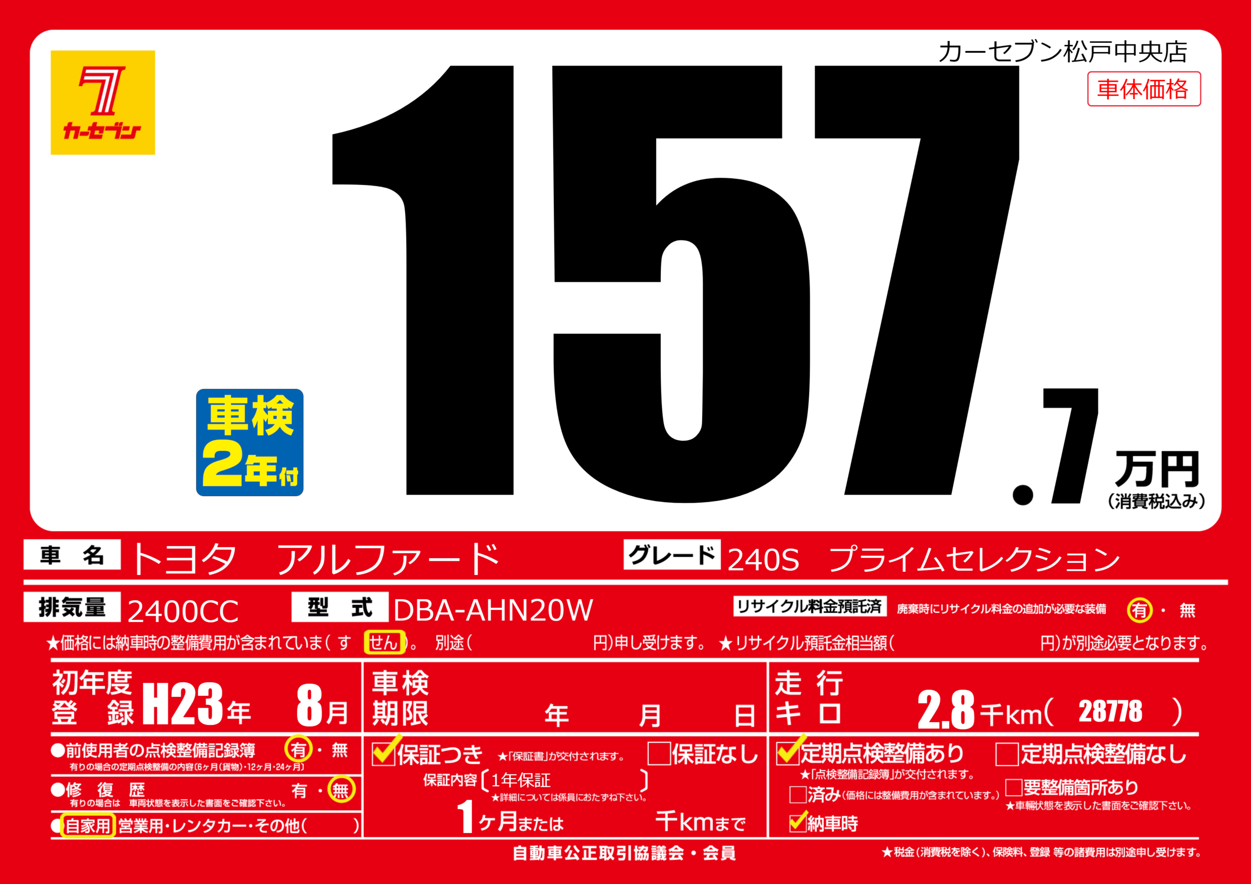 | 走行キロ | 0.2万km | 初年度登録 | H23年8月 |