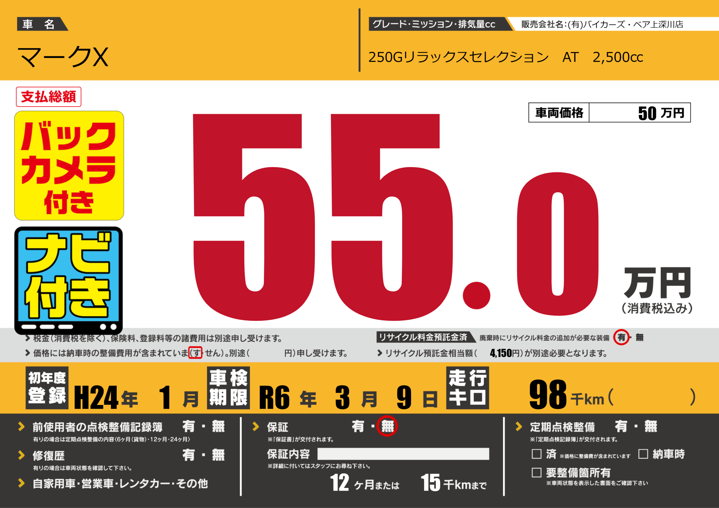 | 走行キロ | 9.8万km | 初年度登録 | H24年1月 |