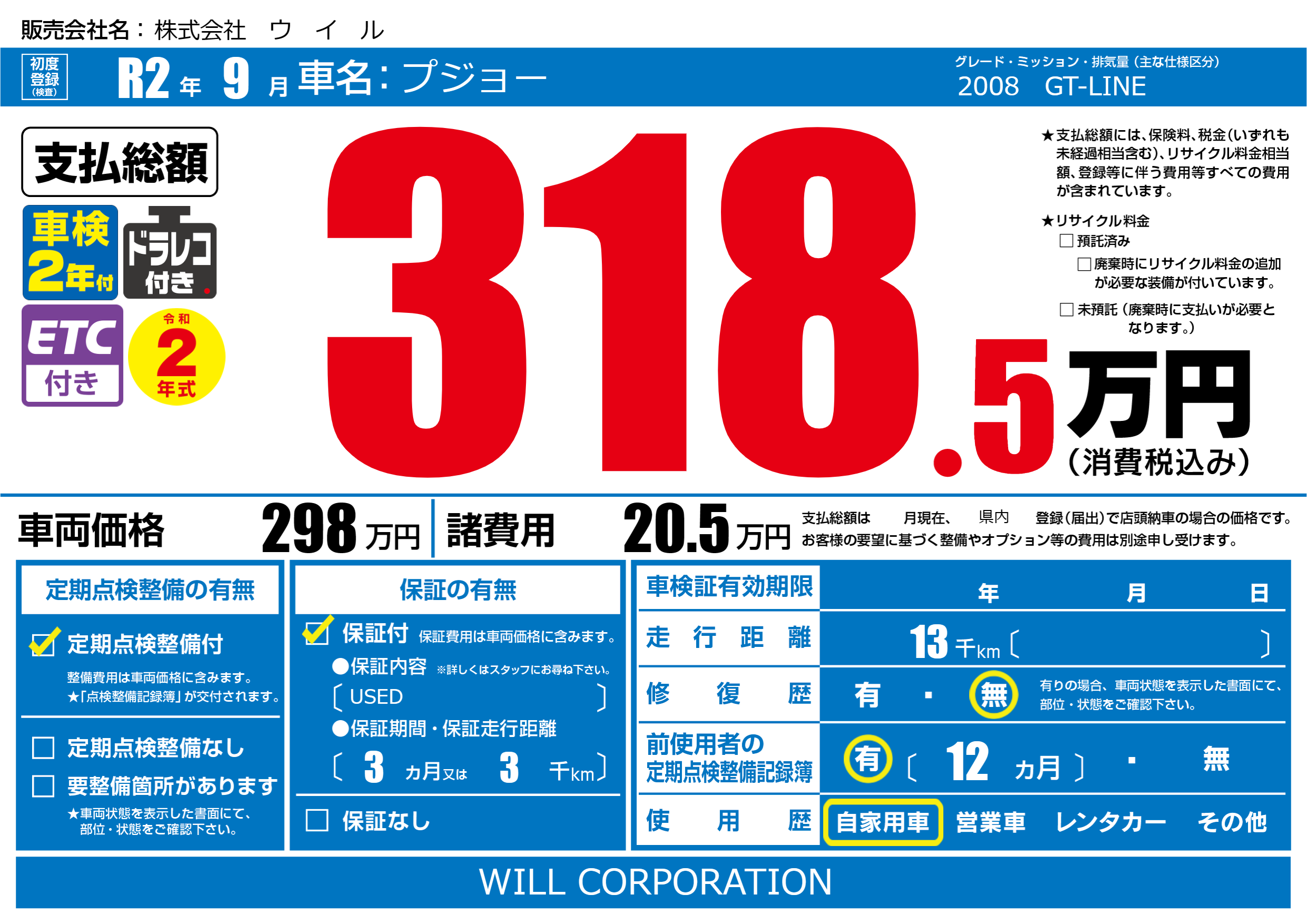 | 車名 | プジョー | グレード ミッション 排気量 |