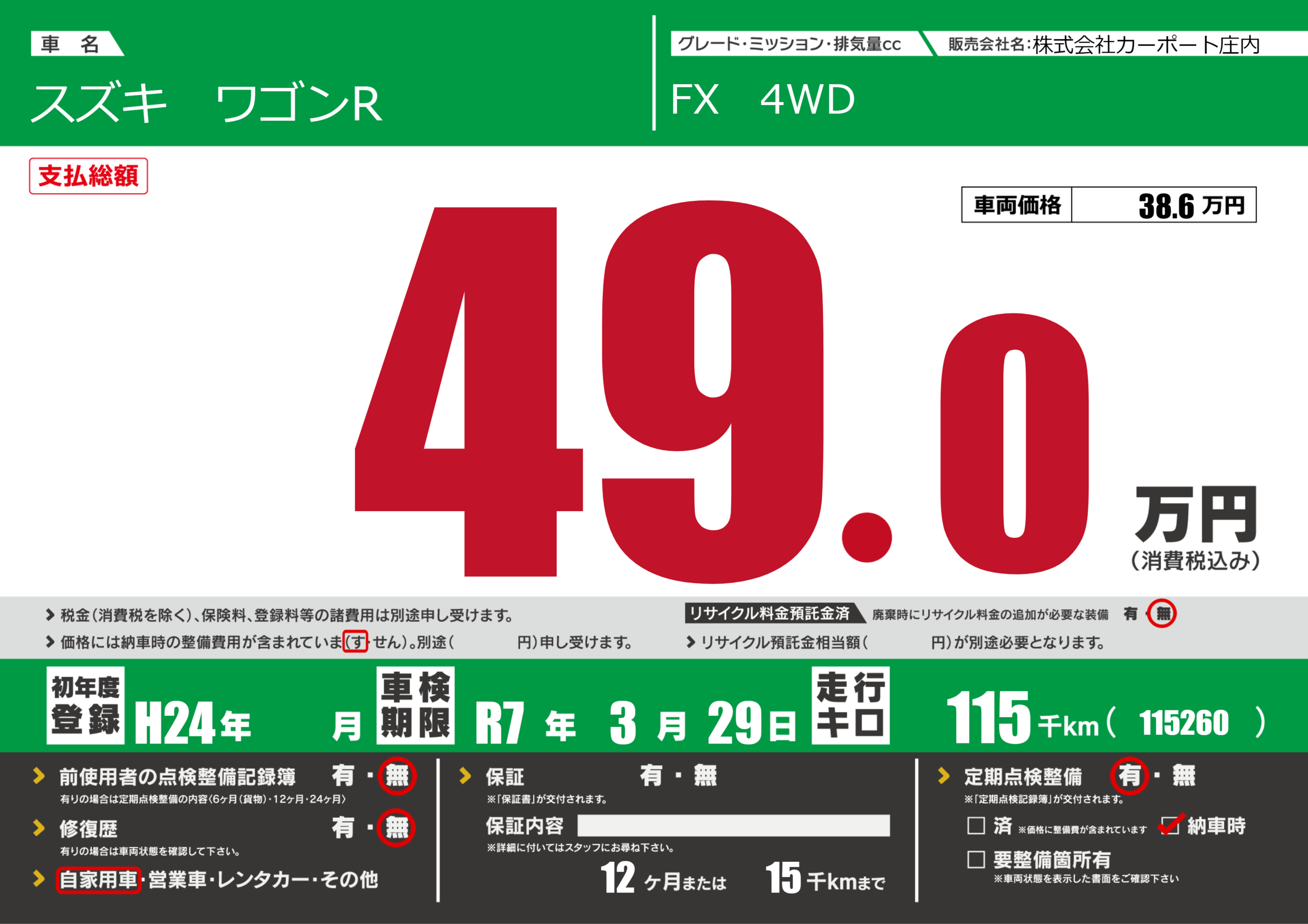 | 車名 | スズキ ワゴンR | グレード ミッション 排気量 |