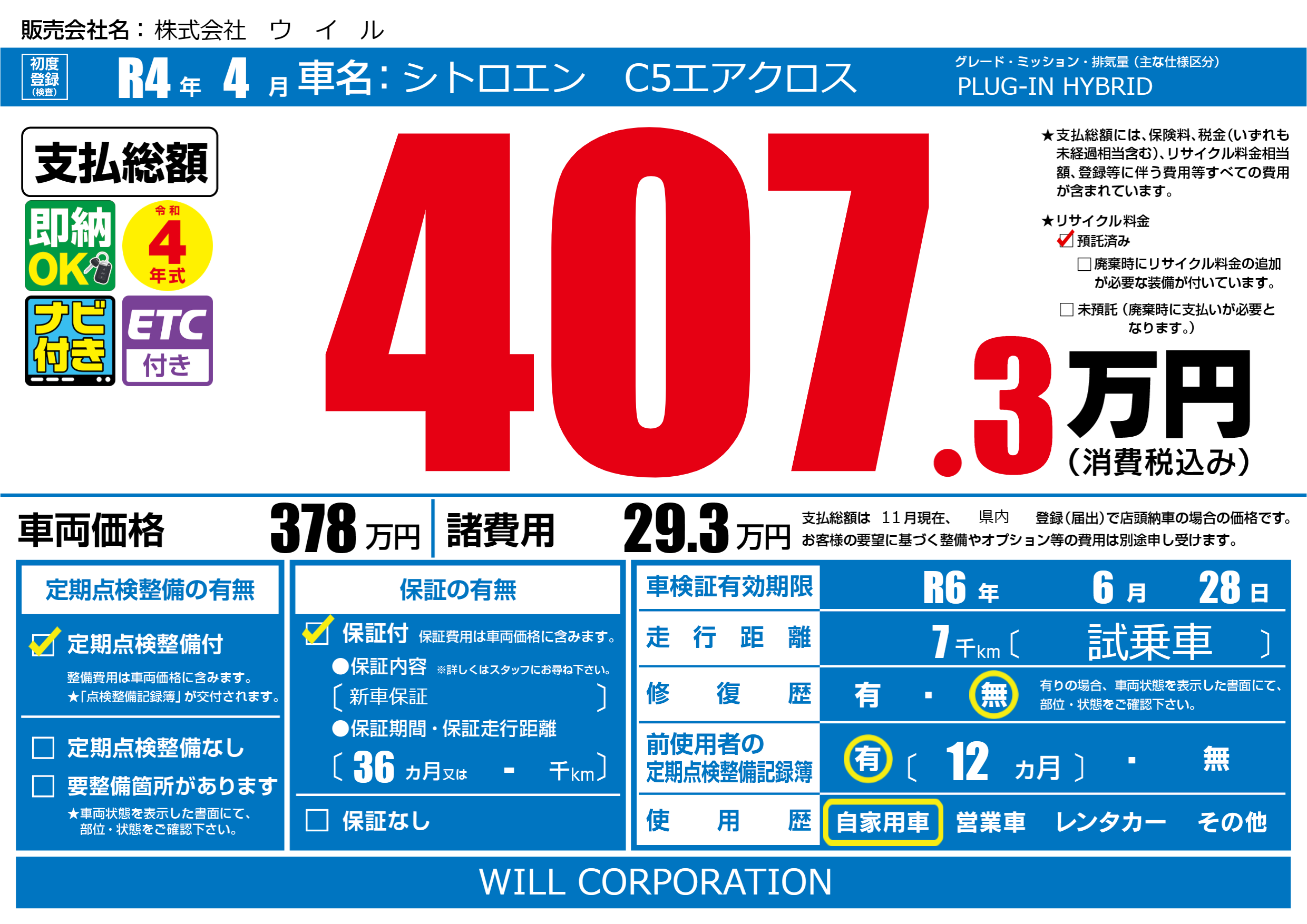 | 車名 | シトロエン C5エアクロス | グレード ミッション 排気量 |