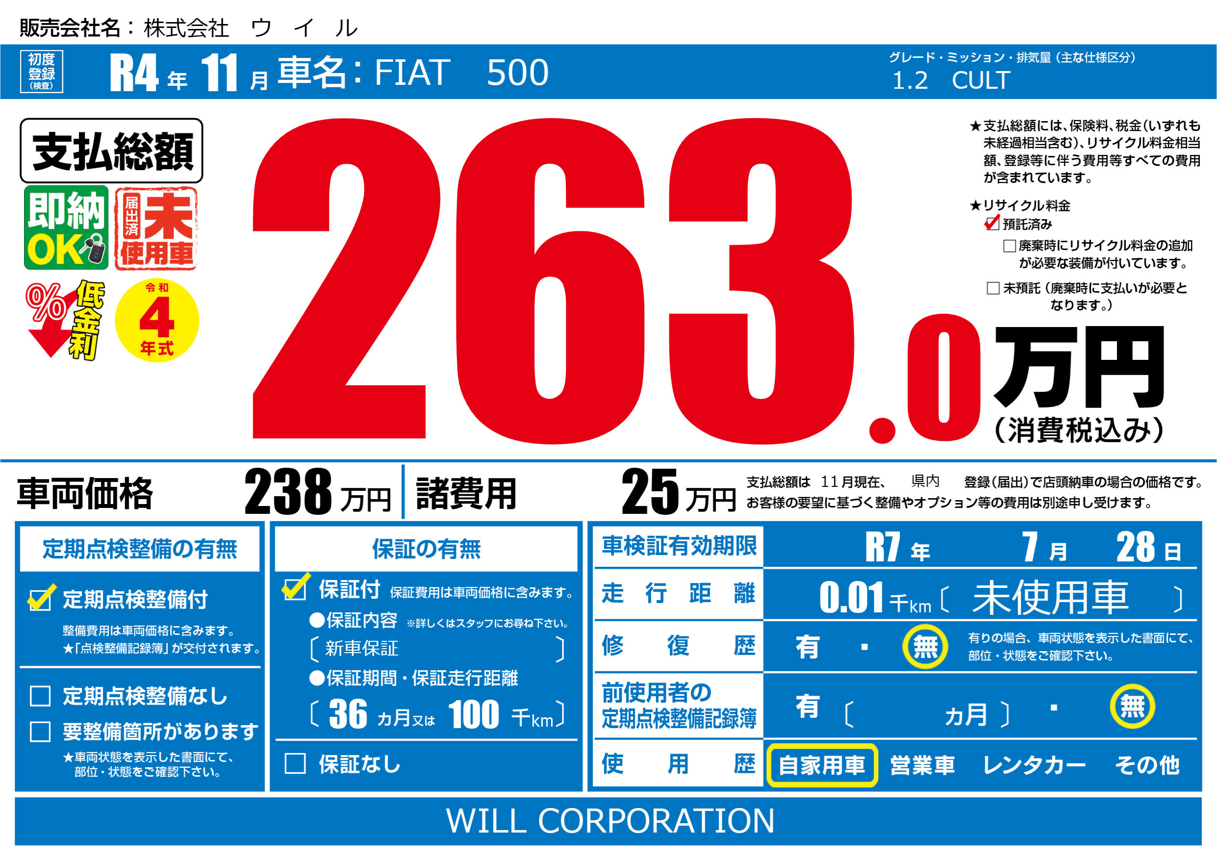 | 車名 | FIAT 500 | グレード ミッション 排気量 |