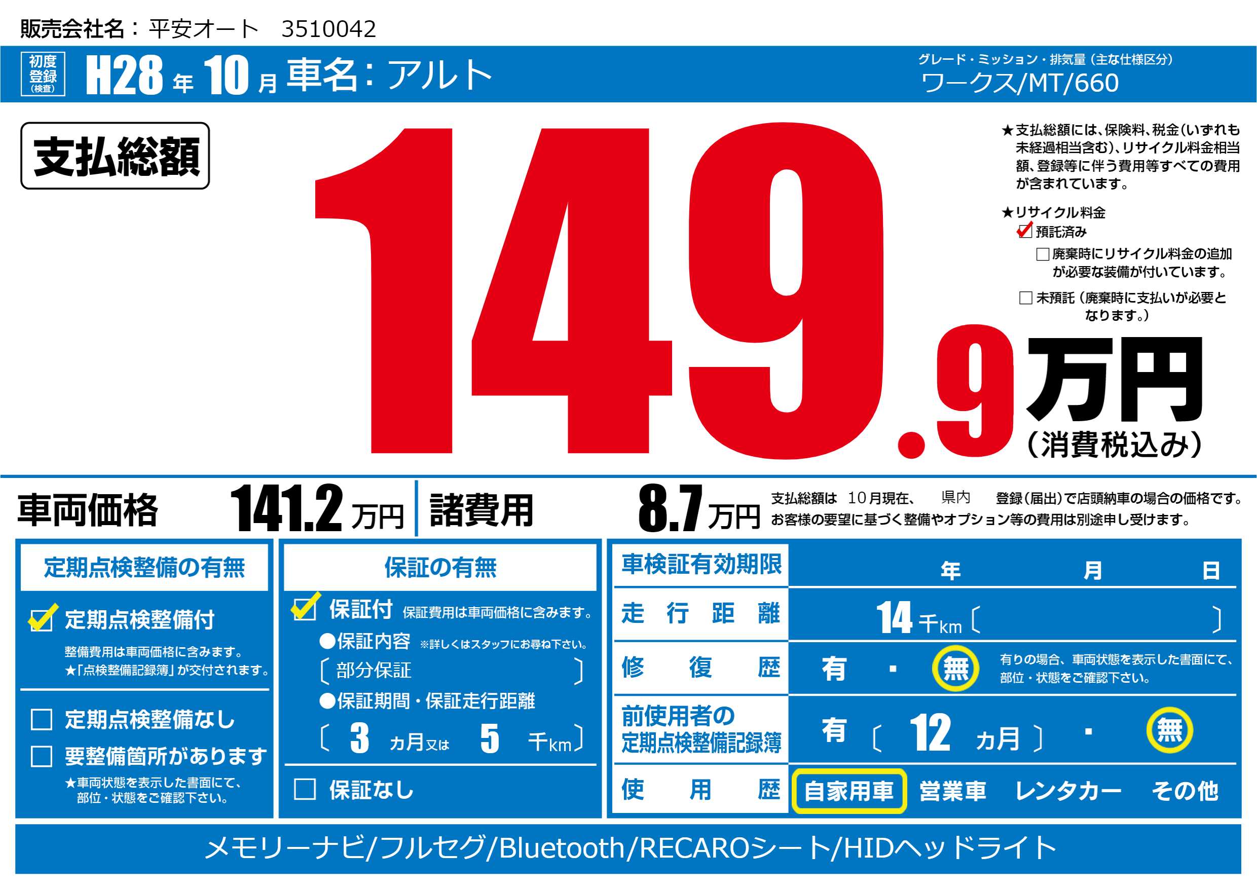 | 走行キロ | 1.4万km | 初年度登録 | H28年10月 |
