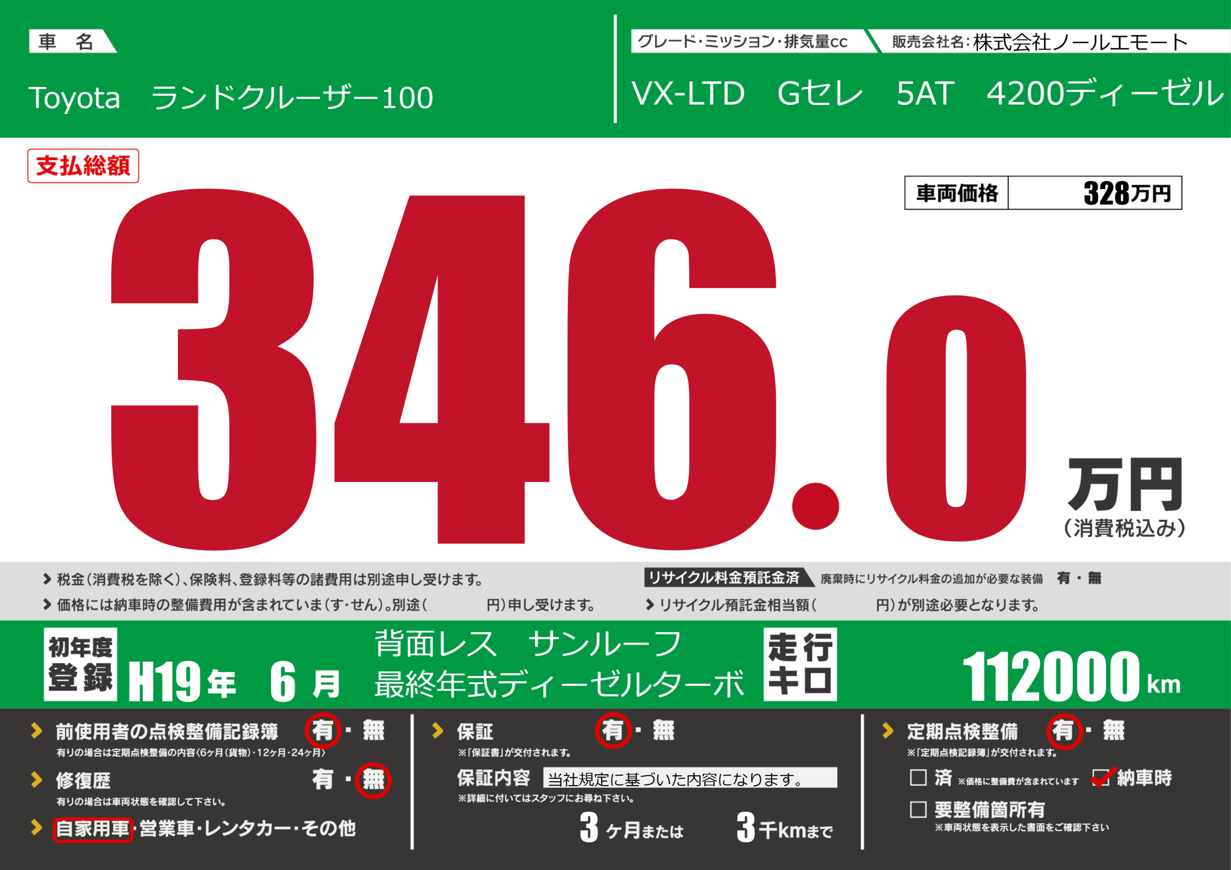 | 定期点検整備 | 定期点検整備あり 納車時あり | ||