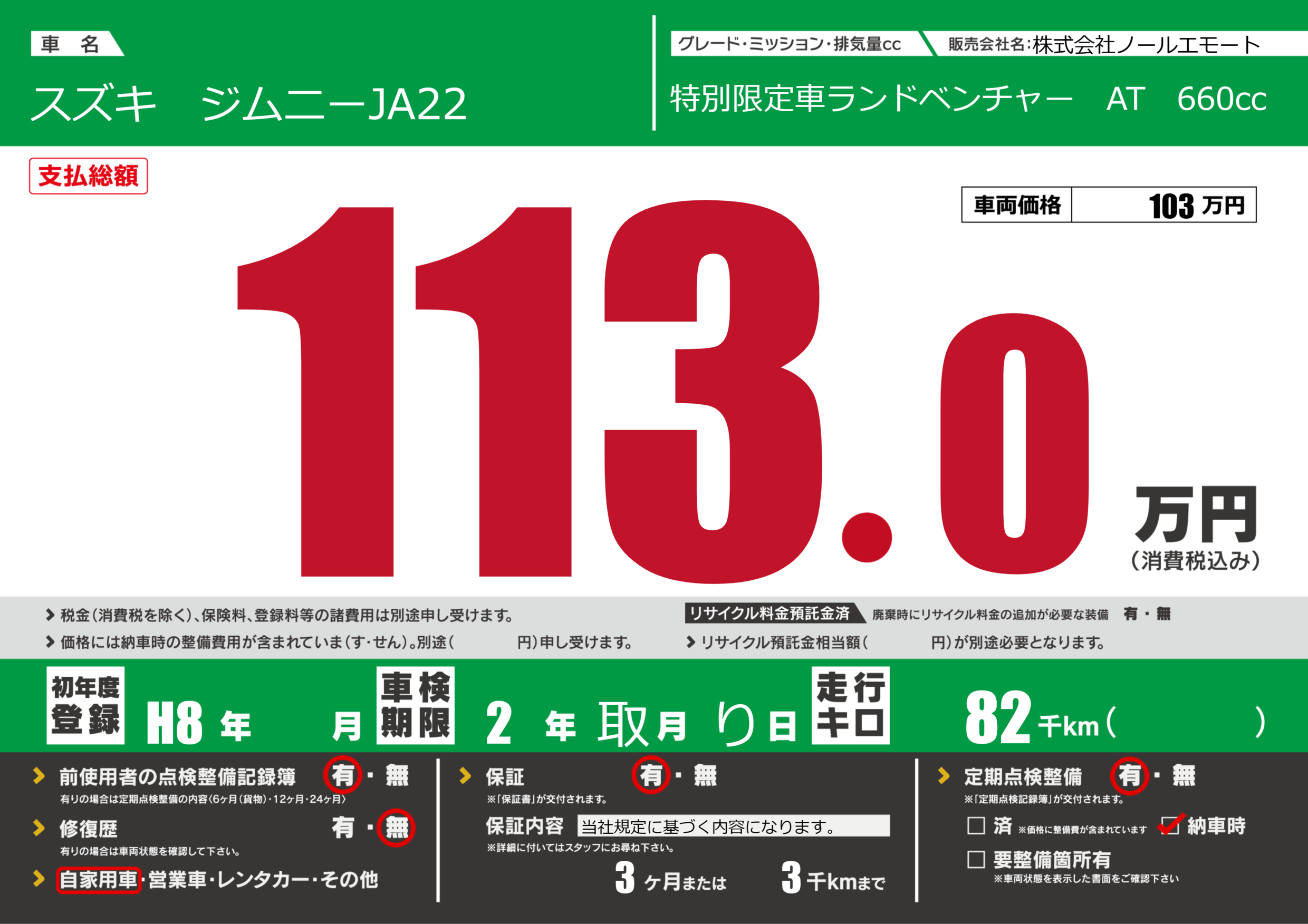 | 定期点検整備 | 定期点検整備あり 納車時あり | ||