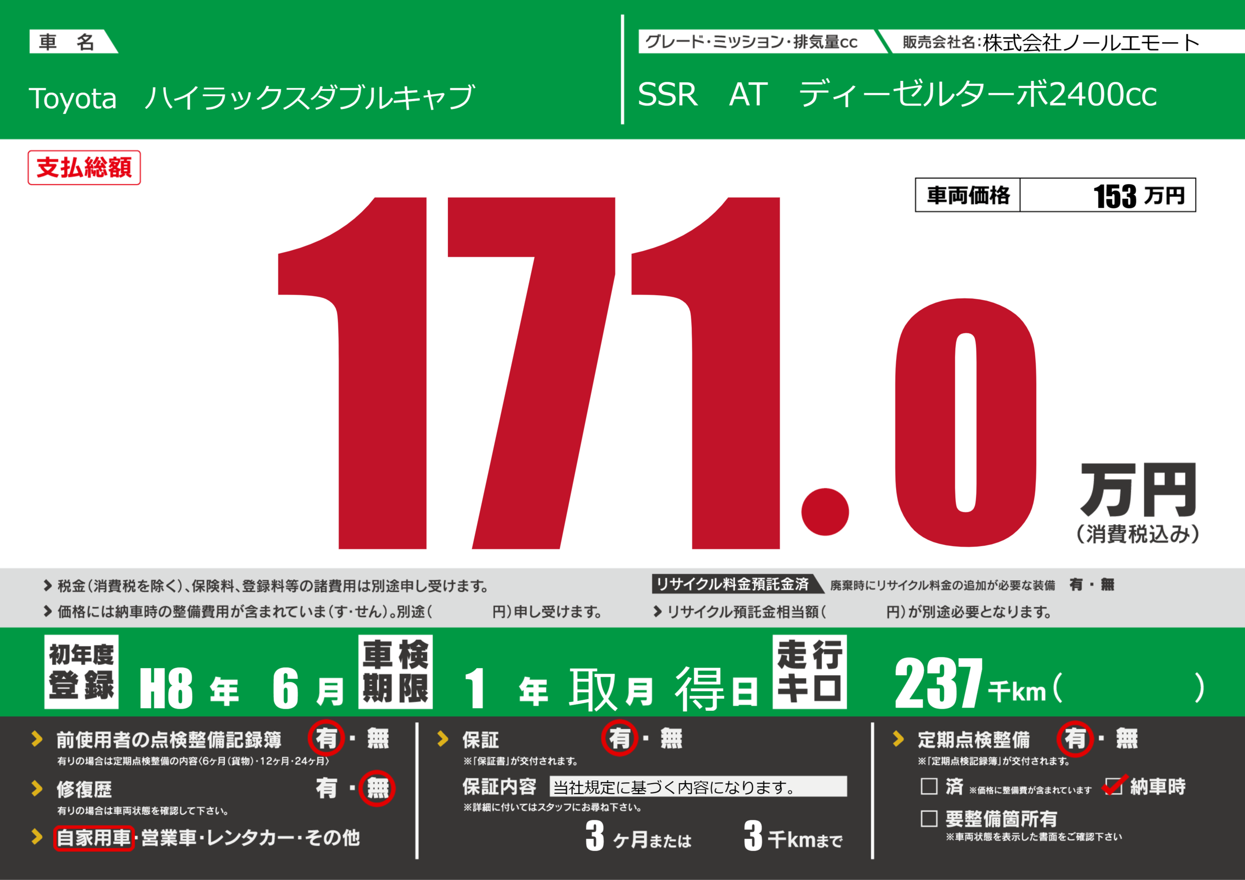 | 走行キロ | 23.7万km | 初年度登録 | H8年6月 |