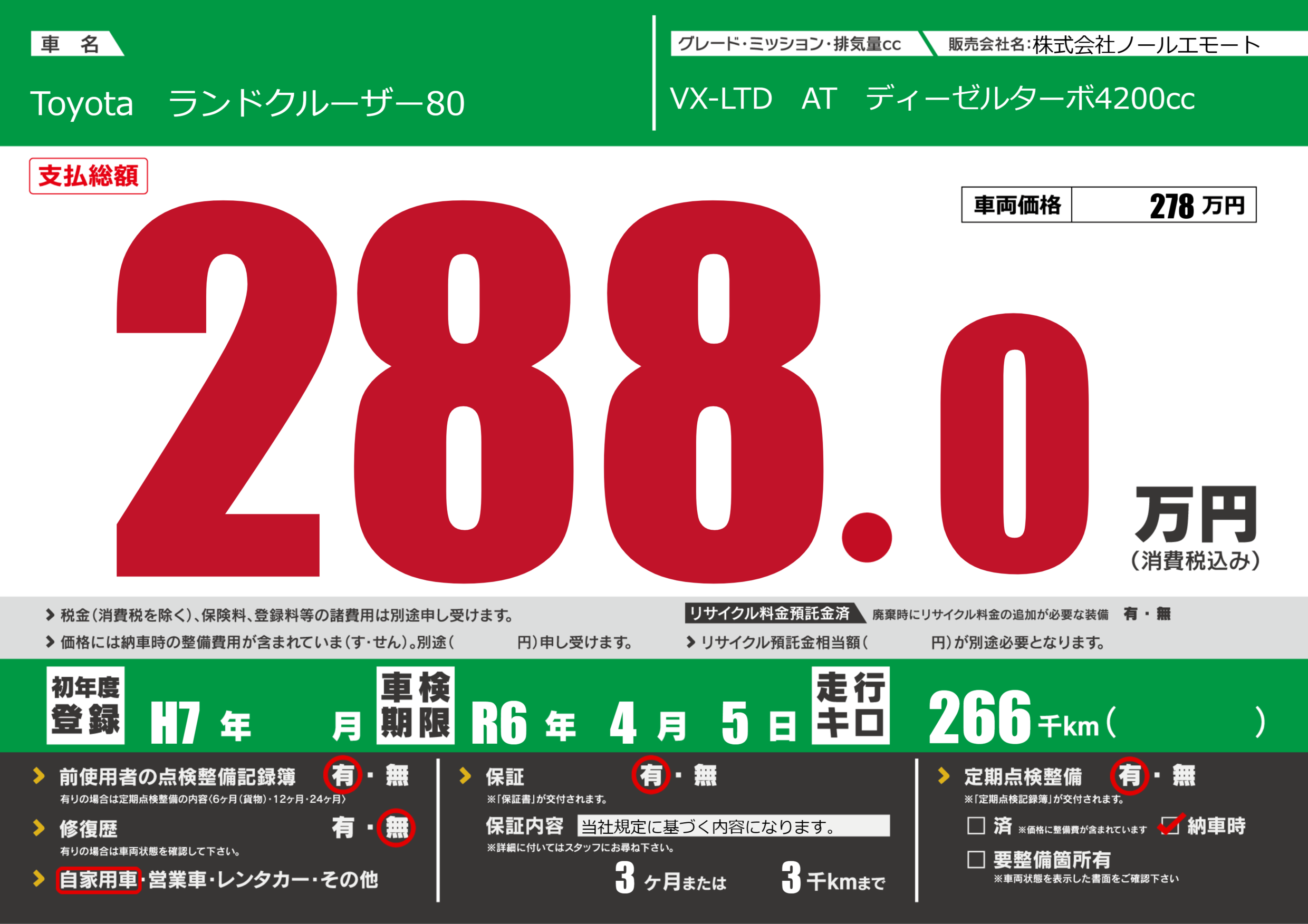 | 走行キロ | 26.6万km | 初年度登録 | H7年---月 |