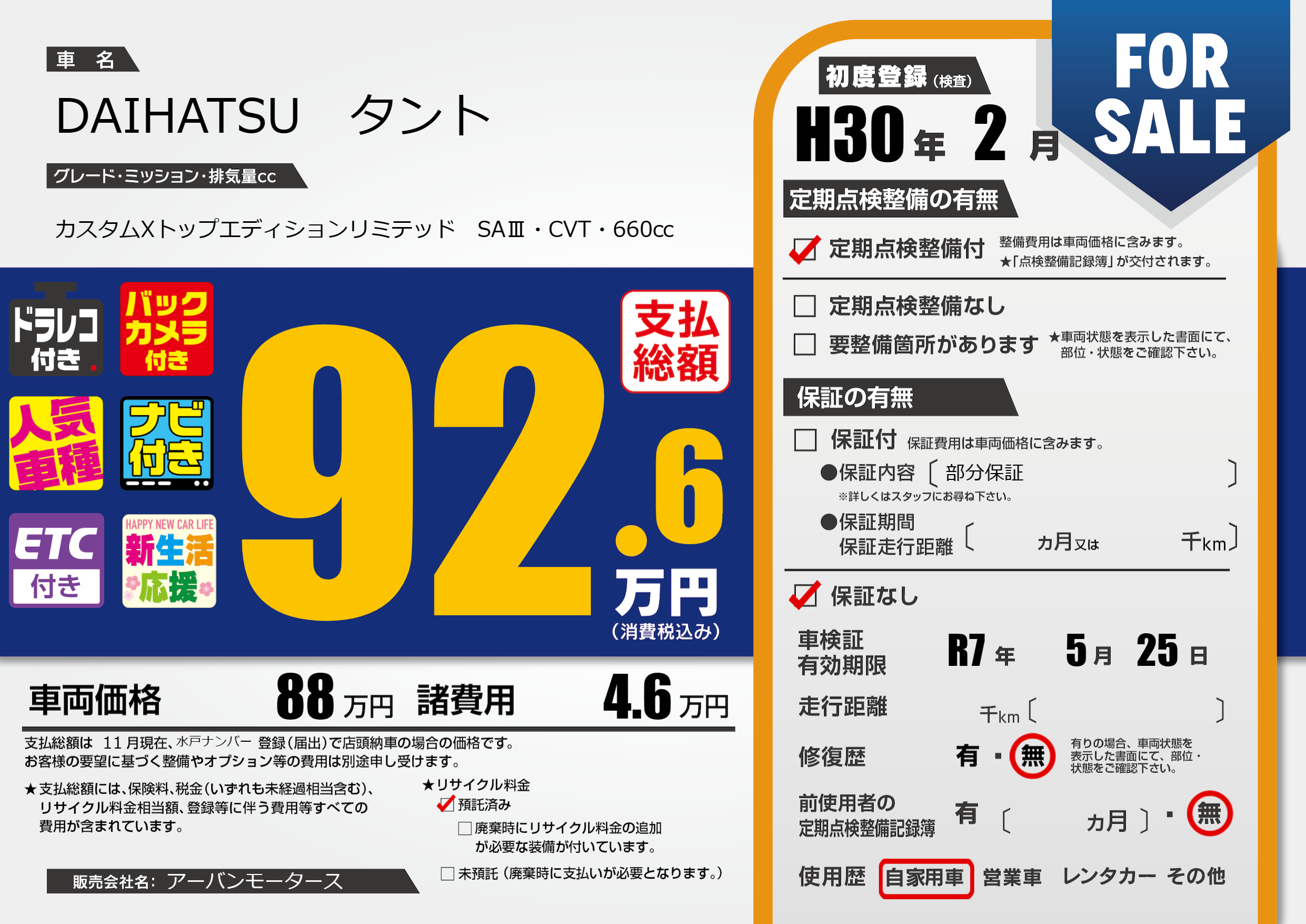 なし | 車検制限 | R7年5月25月 |