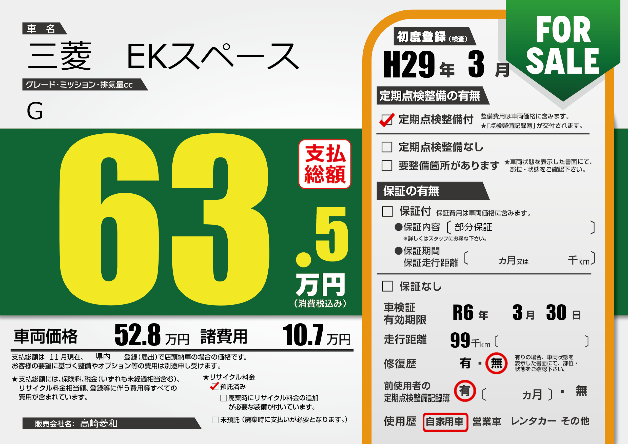 | 車名 | 三菱 EKスペース | グレード ミッション 排気量 |