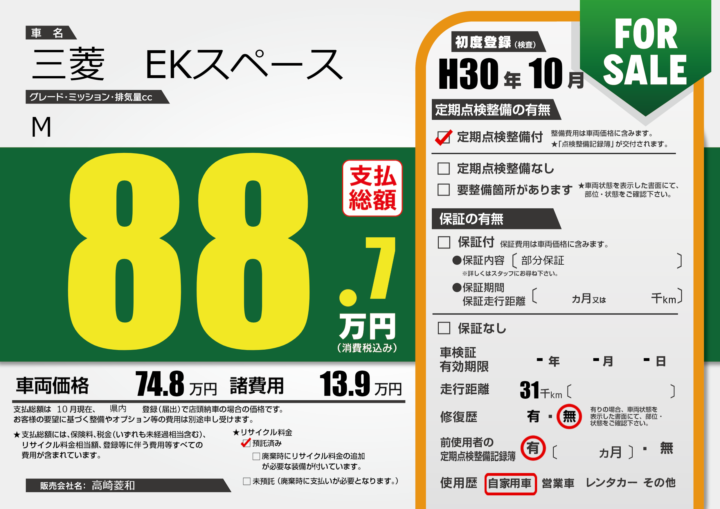 保証なし 保証内容(部分保証) ---ヶ月または()千kmまで |