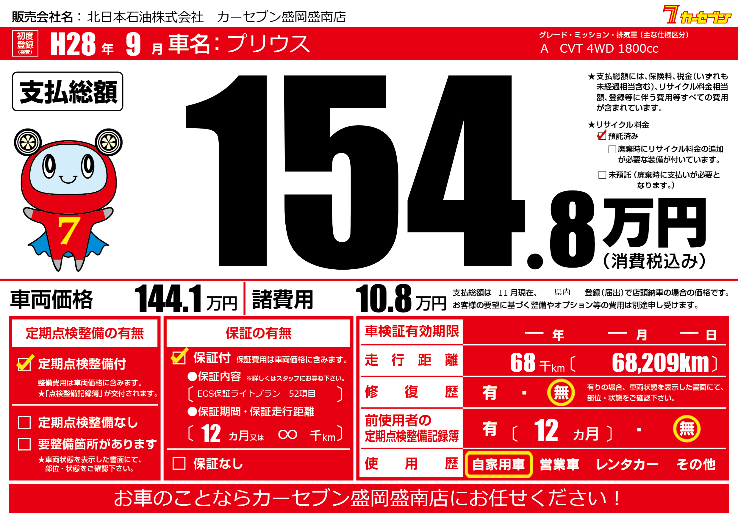 | 車名 | プリウス | グレード ミッション 排気量 |