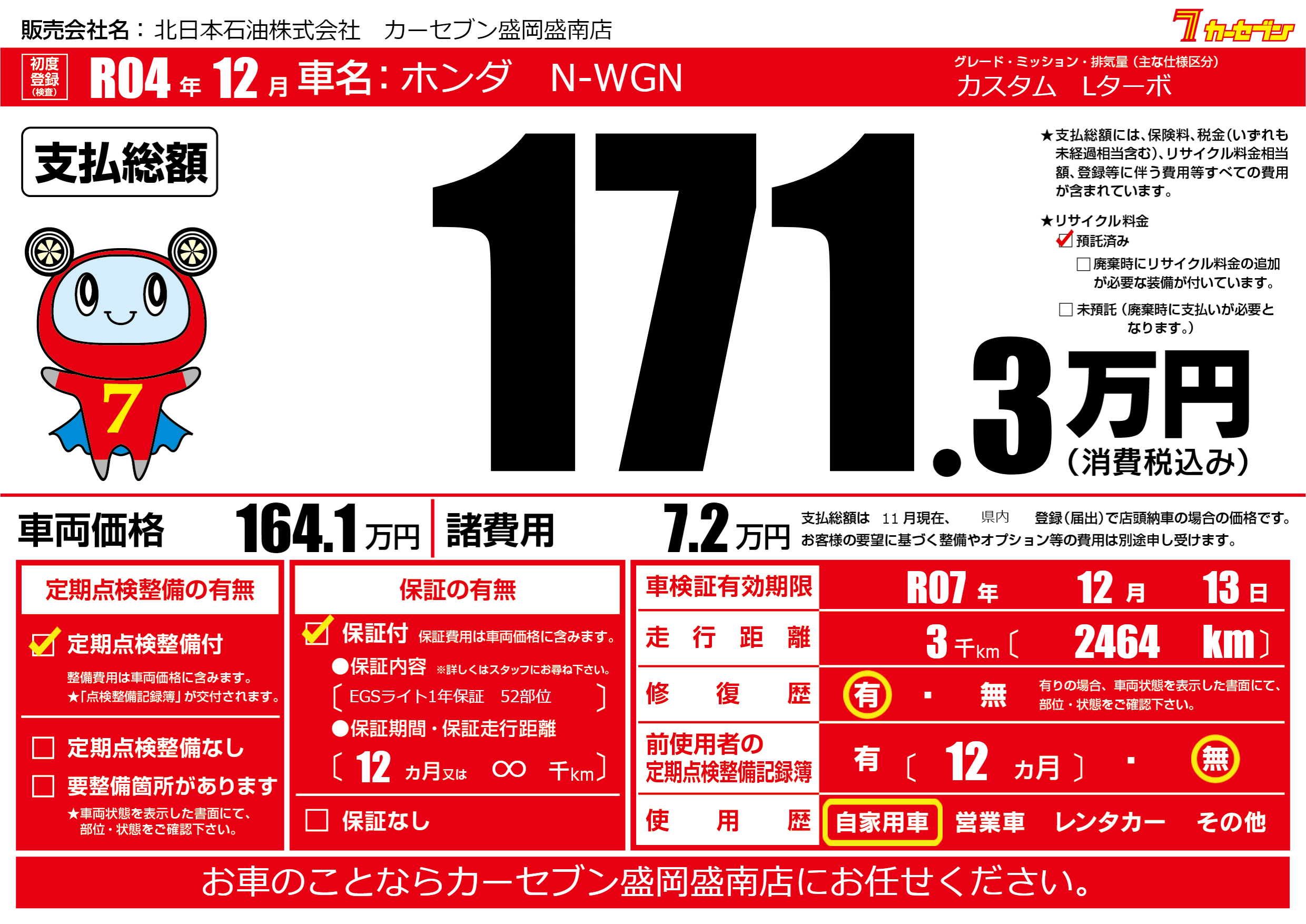 | 車名 | ホンダ N-WGN | グレード ミッション 排気量 |