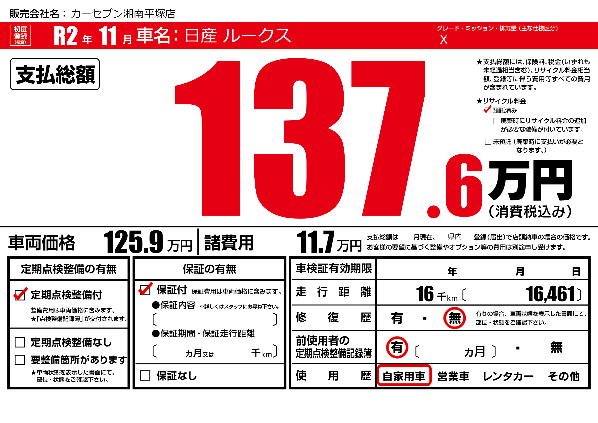 | 車名 | 日産 ルークス | グレード ミッション 排気量 |