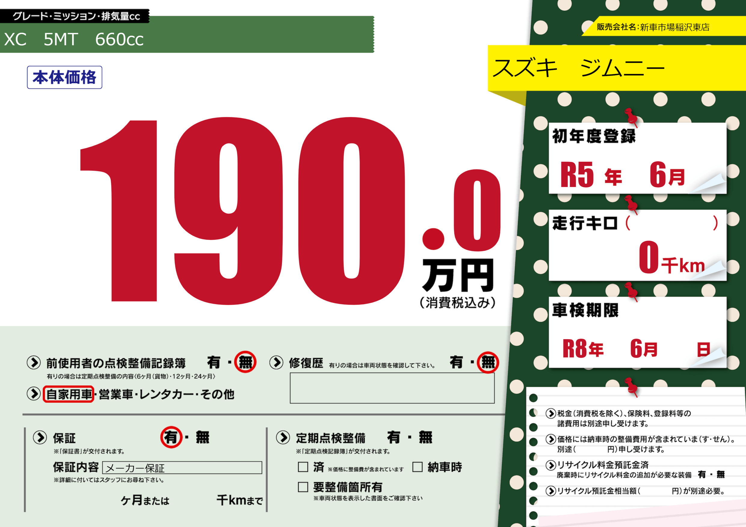 なし | 車検制限 | R8年6月---月 |