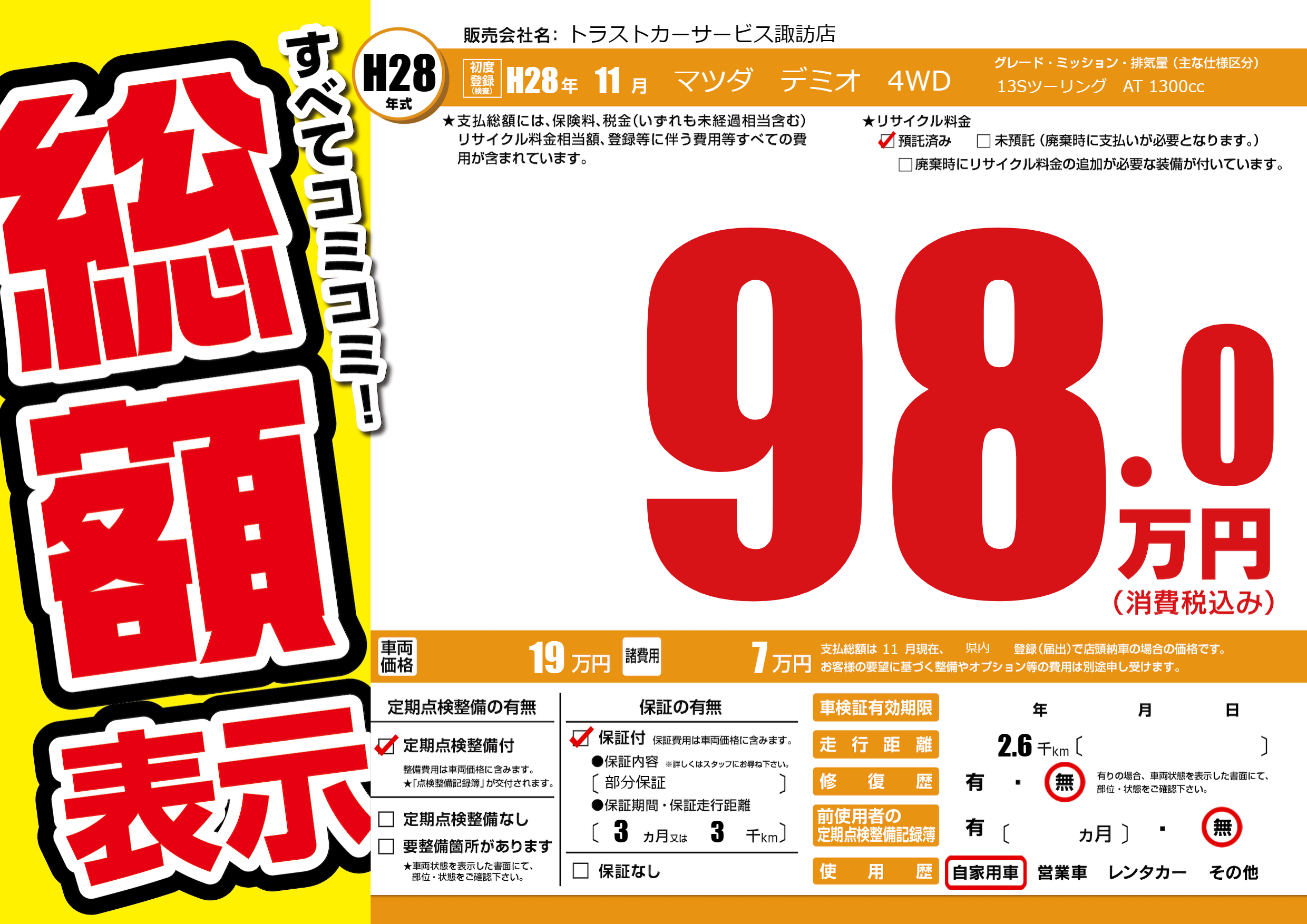 保証付き 保証内容(部分保証) 3ヶ月または(3)千kmまで |