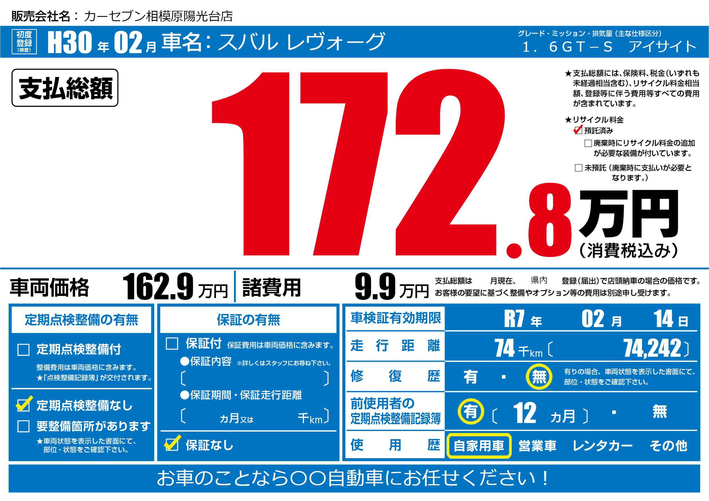 | 車名 | スバル レヴォーグ | グレード ミッション 排気量 |
